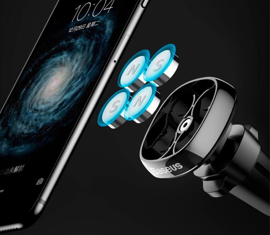 Телефон крепится на держатель с помощью металлической пластины и 4-х неодимовых магнитов. Пластину можно зафиксировать на корпусе гаджета, либо положить под чехол или заднюю крышку.