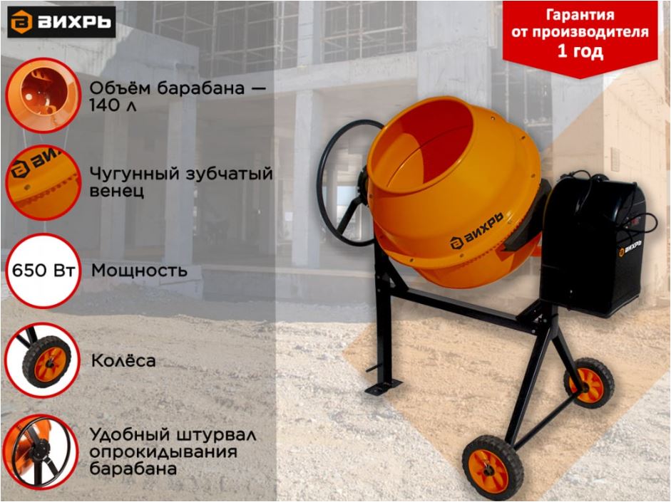 Бетоносмеситель Вихрь БМ-140 – это производительный инструмент гравитационного типа, предназначенный для создания подвижных бетонных смесей с частицами щебня и гравия, а также прочих строительных растворов, в том числе, и из сухих компонентов. В основе данной модели используется электрический двигатель мощностью 650 Вт, который вкупе с усиленной конструкцией обеспечивает высокую производительность. Максимальная скорость вращения барабана может достигать 29.5 об/мин. Общий объем бака составляет 140 л, что позволяет создавать до 100 л готового раствора.