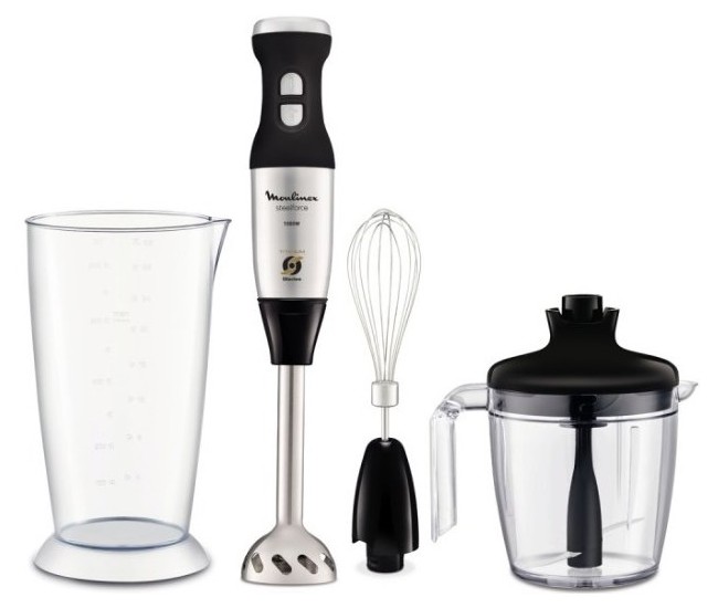 Блендер Moulinex DD885D39 черно-серебристой расцветки обладает мощностью 1000 Вт, что является одним из самых высоких показателей для погружных моделей. При этом интенсивность работы можно регулировать в пределах 10 скоростей, а также при необходимости задействуются импульсный и турборежимы. Пластиковый корпус прибора оснащен прорезиненным покрытием против скольжения, а погружная часть изготовлена из нержавеющей стали. Функционал производительного прибора вполне традиционный: он оснащен венчиком, измельчителем и блендером.