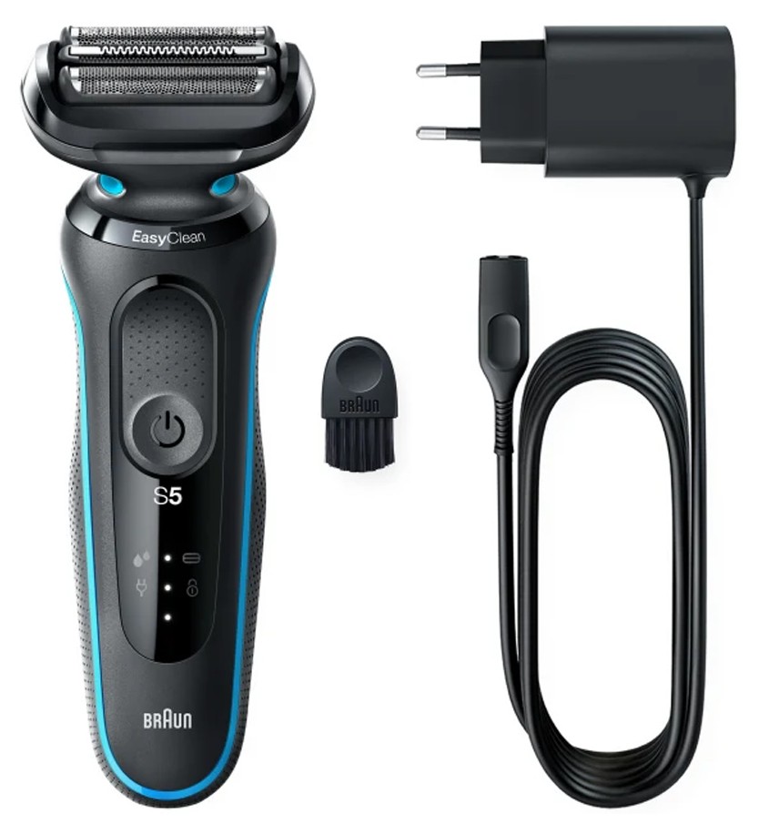 Эргономичный корпус с прорезиненным покрытием позволяет комфортно удерживать бритву. Одного заряда аккумулятора хватает для 50 минут автономной работы. В комплекте с электробритвой Braun S5 51-M1000s поставляется насадка Precision Trimmer для усов и бакенбард. Из принадлежностей в набор входят зарядное устройство, защитная крышка и щеточка для чистки.