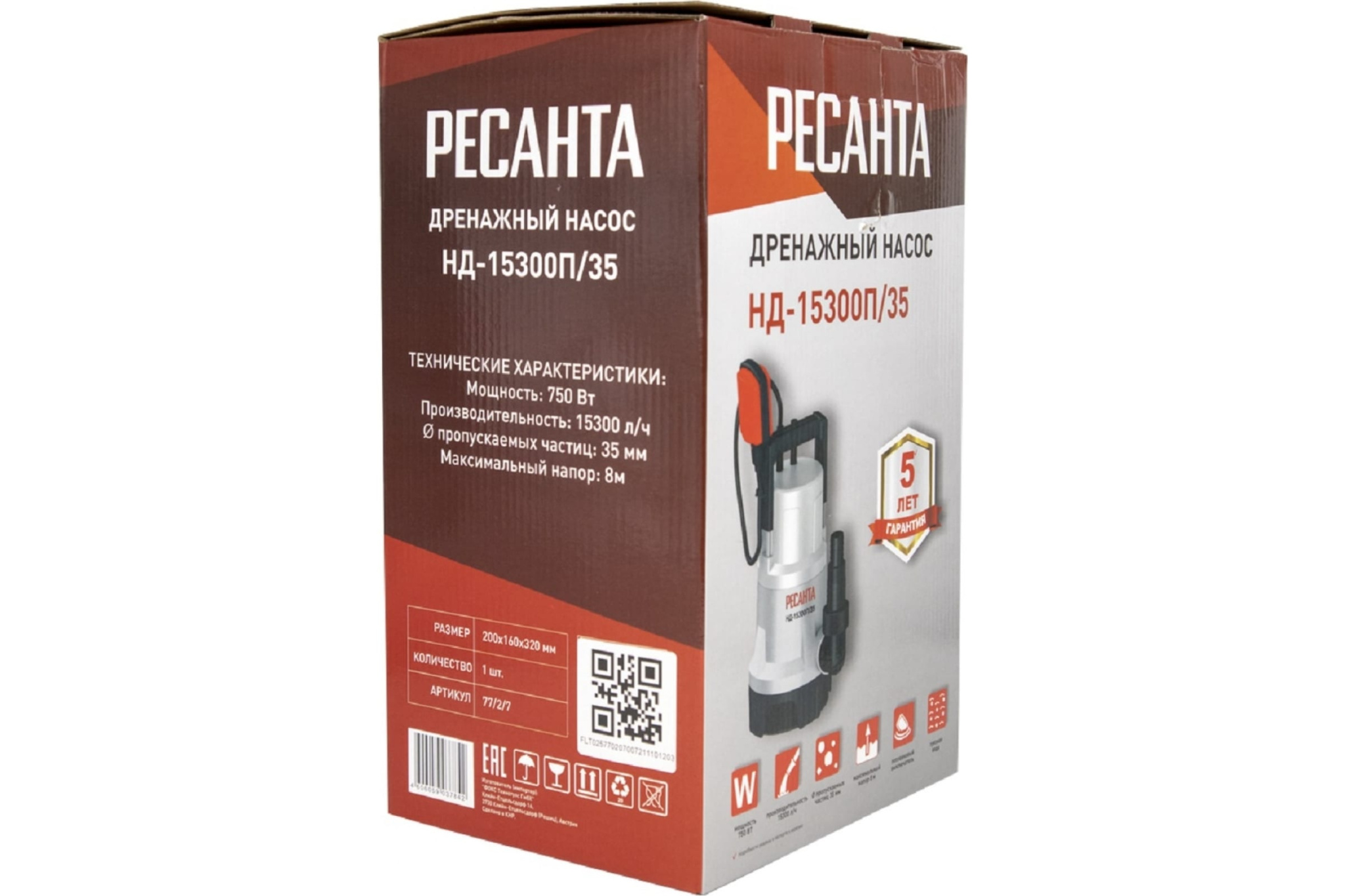 Дренажный насос Ресанта НД-15300П/35 77/2/7 предназначен для откачки воды из рек и водоемов. Допускается средний уровень загрязненности воды. Также дренажные насосы используются для орошения и подачи воды с глубины.
