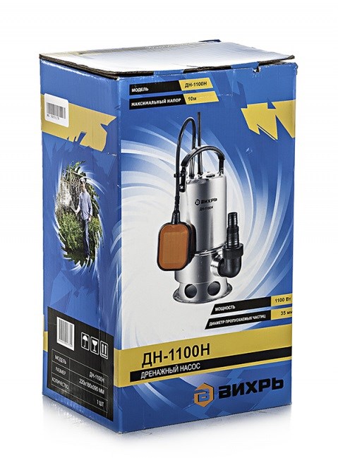 Дренажный насос Вихрь ДН-1100Н предназначен для откачивания и отведении воды и стоков с инородными примесями из различных водоёмов и резервуаров. С его помощью можно выкачивать воду в случае подтопления жилых помещений и подвалов. Электродвигатель насоса асинхронный, однофазный с короткозамкнутым ротором. От перегрузки насос защищает термопротектор, отключение происходит автоматически, насос оснащён внешним поплавковым выключателем. Отличие модели ДН-1100Н от ДН-1100 в том, что корпус у ДН-1100Н изготовлен из нержавеющей стали.