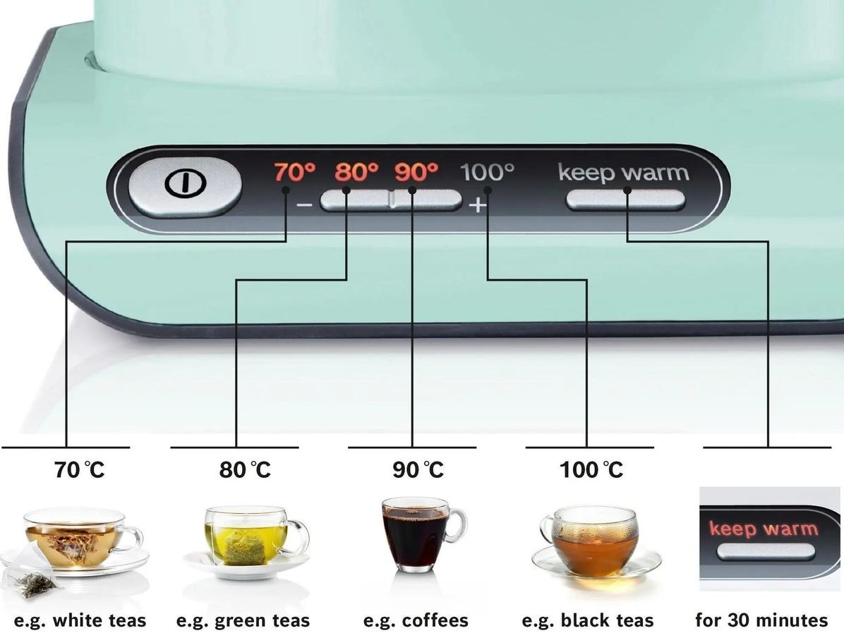 Конструкция электрического чайника BOSCH TWK8612P предусматривает наличие вращающейся подставки, на которой расположены кнопки, регулирующие температуру нагрева в диапазоне от 70 до 100 градусов, что позволяет заваривать различные сорта чая или нагревать воду для детского питания. Закрытый нагревательный элемент обеспечивает безопасность и простоту ухода. Предусмотрены опции регулирования и поддержания нужной температуры.