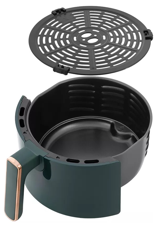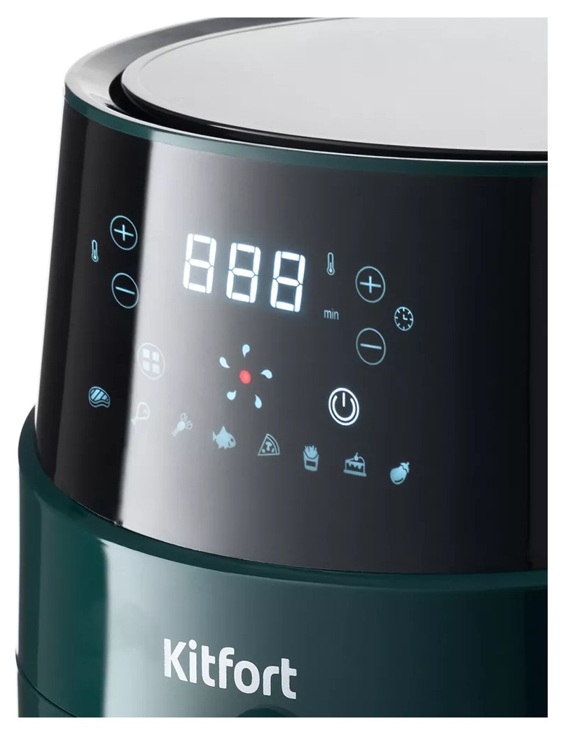 Аэрогриль Kitfort КТ-2222 представлен в необычном зеленом корпусе со съемной крышкой. Благодаря мощности 1500 Вт устройство быстро разогревается до нужной температуры в диапазоне от 80°C до 200°C. Имеется чаша и колба объемом 3.3 л, кабель длиной 70 см.