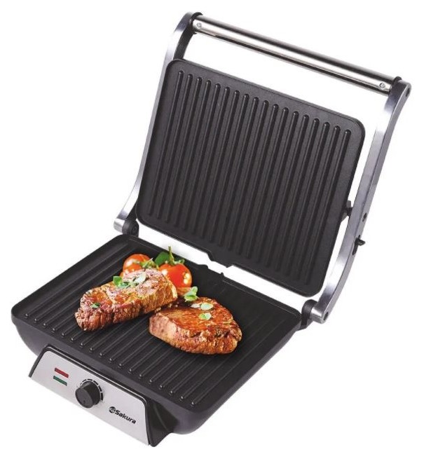 Гриль электрический, мощность 2000 Вт, регулируемый термостат (максимальная температура 240°С), 2 рифленые панели для жарки, размер панели 29,7х23,6 см, антипригарное покрытие, открытие панелей на 180° (возможность приготовления на 2 пластинах одновременно), индикатор работы, прорезиненные ножки. Корпус из нержавеющей стали и термостойкого пластика. Комплектация: резервуар для сбора масла.