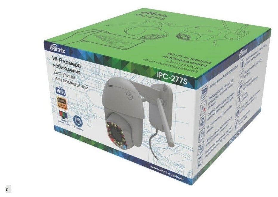 Ritmix IPC-277S — это современная полнофункциональная поворотная камера наблюдения в защищенном корпусе для улицы или для помещений. Может успешно использоваться для наблюдения за домом, подъездом, дачей, гаражом, двором, придомовой территории, детской площадкой и т.д. Обеспечивает цветную ночную видеосъёмку. Имеет и встроенный модуль Wi-Fi, и возможность проводного подключения к интернет-сети через разъём RJ45 (10/100M). Видеозапись ведётся на карту памяти (micro SD, до 128 Гб) или в облачное хранилище (по выбору пользователя) в разрешении Full HD 1080p непрерывно либо короткими файлами при обнаружении движения PIR датчиком камеры.