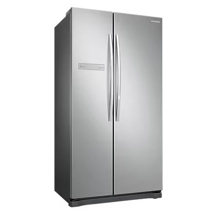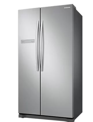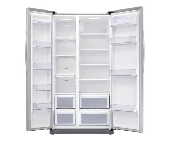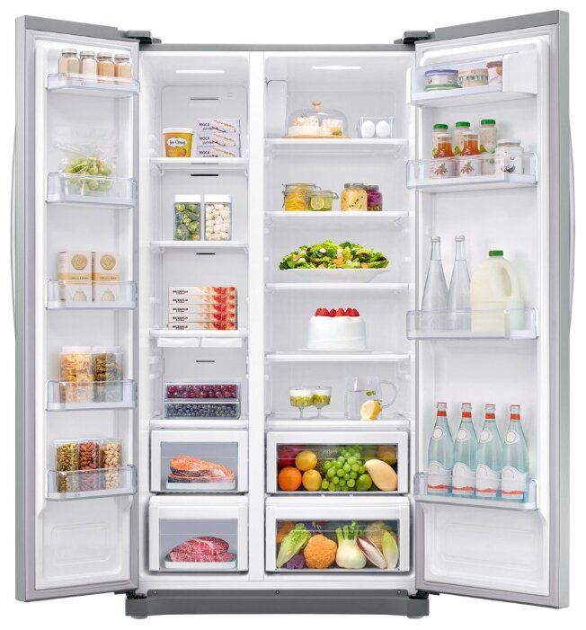 Холодильник Samsung RS54N3003SA представляет собой вместительный холодильный агрегат, который обладает необычной конструкцией: он предусматривает вертикально расположенные холодильную и морозильную камеры. Выполнен прибор в корпусе размером 91.2x73.4 см и обладает объемом 535 л. Внутренний объем холодильного отделения достигает 356 л. Пространство в нем разделено пятью устойчивыми полочками из закаленного стекла и двумя ящиками для фруктов и овощей. Продукты можно складывать также и на дверцах, ведь там размещены четыре полочки.