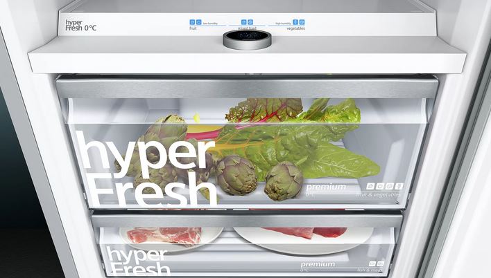 -Продукты остаются свежими до 3 раз дольше в герметичной зоне свежести hyperFresh premium 0°С: в отделении для овощей и фруктов переключателем можно регулировать влажность, а в отделении для мяса и рыбы - на дисплее регулировать температуру.