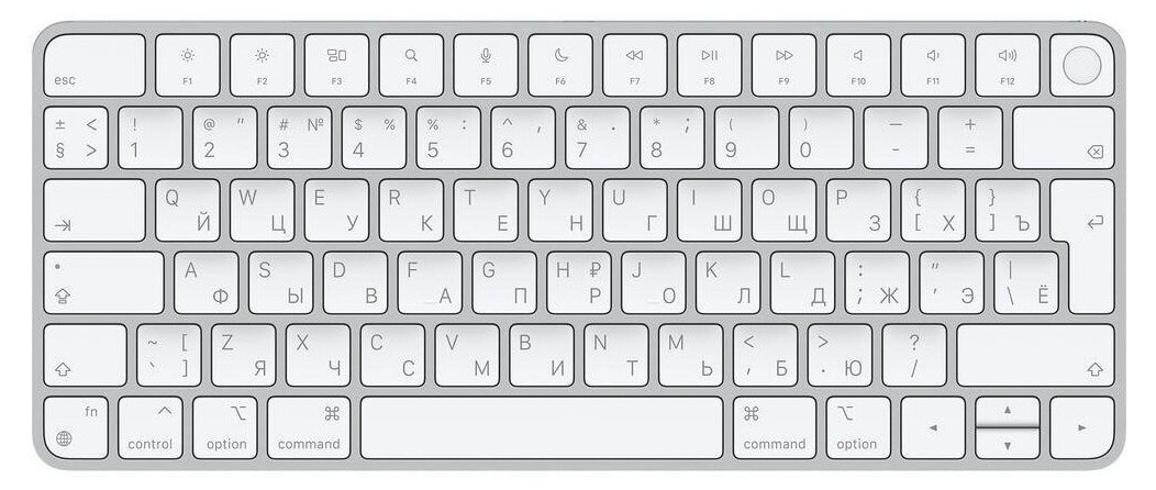 Apple Magic Keyboard с Touch ID содержит 79 клавиш с раскладкой ISO. Подключается клавиатура через Bluetooth быстро и без лишних действий. Она работает от аккумулятора, который будет работать около месяца без подзарядки. Для восполнения заряда можно воспользоваться кабелем USB‑C/Lightning. Ее особенность в поддержке Touch ID ‒ датчика для безопасной и быстрой авторизации на сайтах.