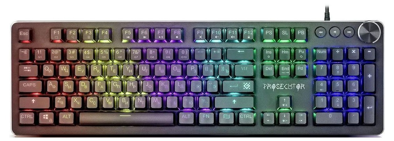 Клавиатура проводная Defender Prosecutor GK-370L – удобная для игры и работы механическая модель со 107-ю клавишами. Устройство имеет отдельный цифровой блок, ряд Fn, 4 дополнительные клавиши для управления мультимедиа, громкостью динамиков и подсветки клавиатуры. Также имеется удобная функция Anti-Ghosting для защиты от залипания.