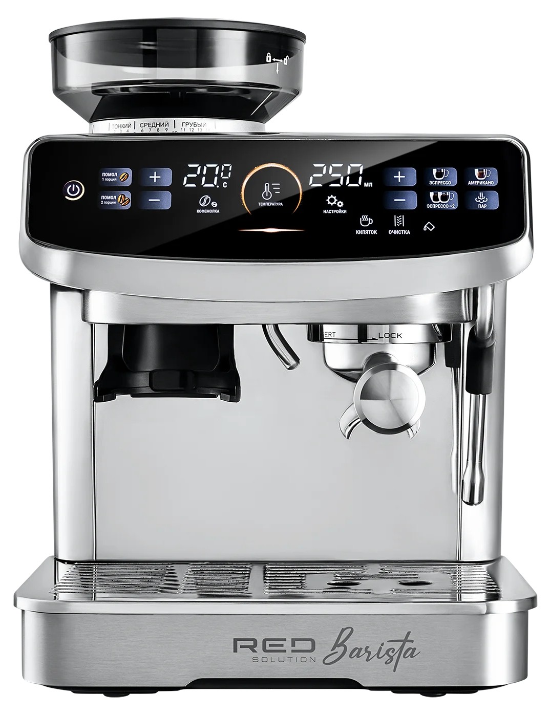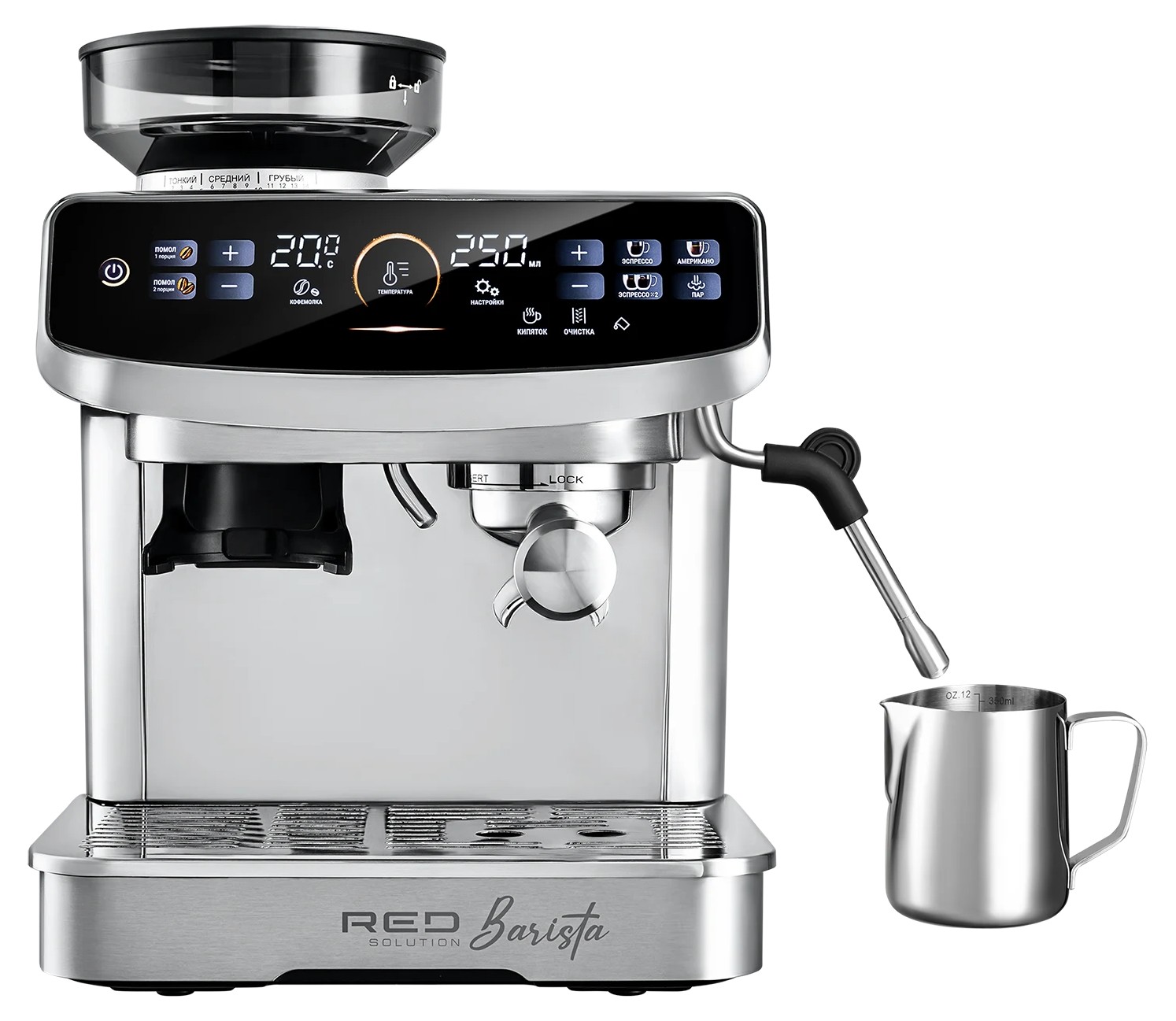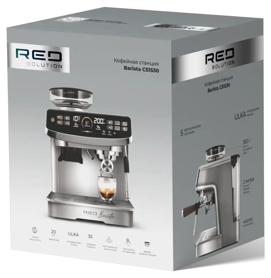 RED SOLUTION Barista CS1530 – это кофейная станция в стильном металлическом корпусе, созданная для тех, кто любит готовить кофе как профессионал. Встроенная жерновая кофемолка с расширенным спектром уровней помола, высокое давление в 20 бар и функция предварительного смачивания обеспечивают максимум вкуса и аромата кофе. В комплекте к станции идут цельнометаллические аксессуары из нержавеющей стали для приготовления идеального кофе: темпер для утрамбовки кофейной таблетки в рожке и питчер для молочной пены – все для того, чтобы вы почувствовали себя настоящим бариста у себя дома.