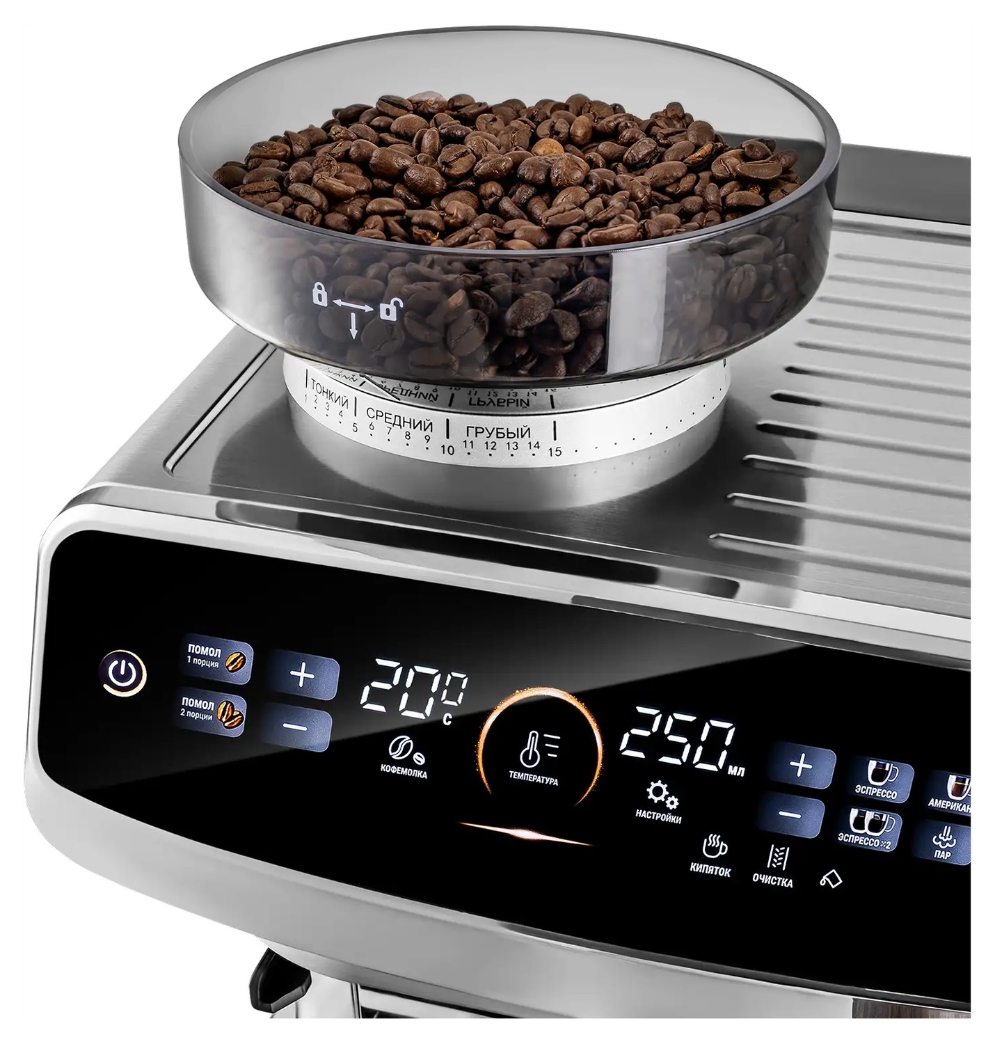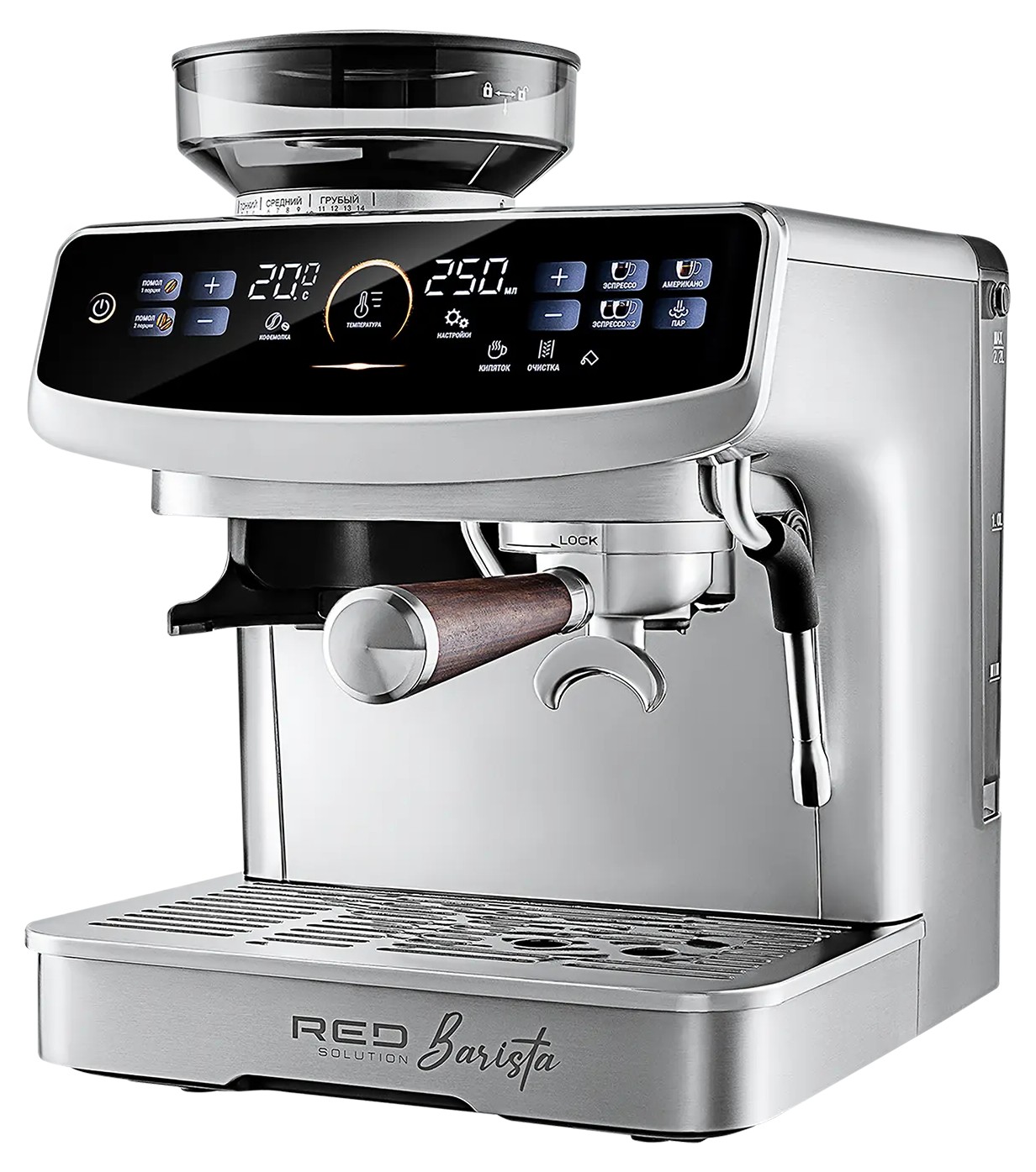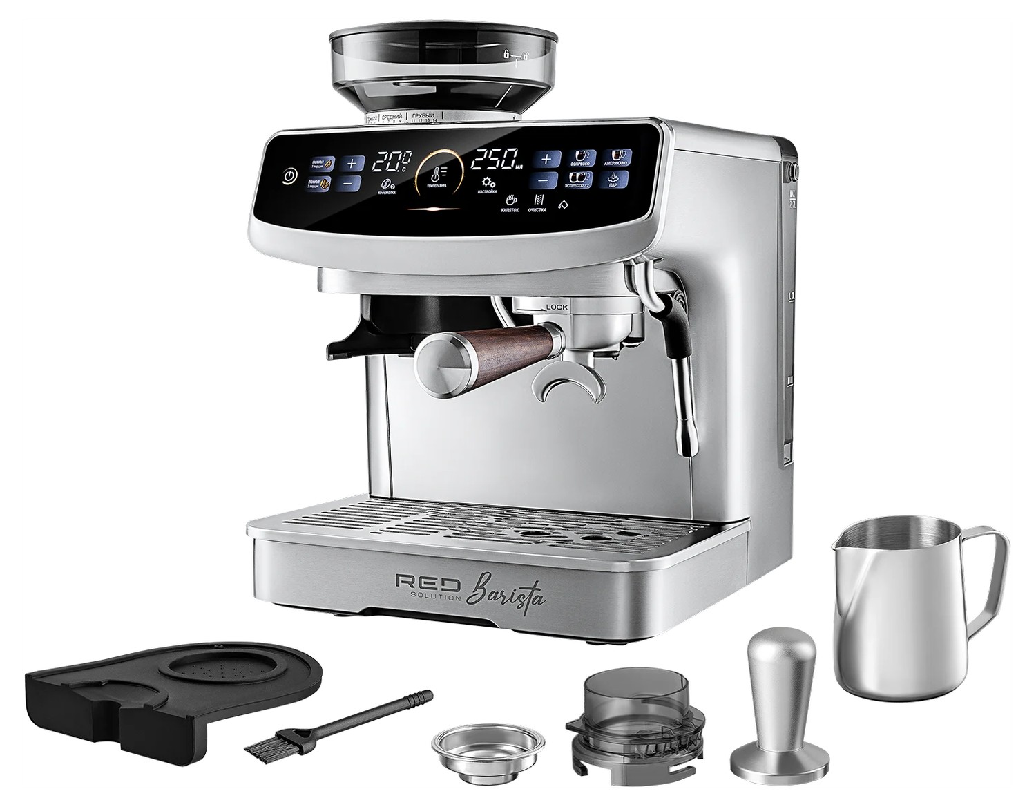 RED SOLUTION Barista CS1530 – это кофейная станция в стильном металлическом корпусе, созданная для тех, кто любит готовить кофе как профессионал. Встроенная жерновая кофемолка с расширенным спектром уровней помола, высокое давление в 20 бар и функция предварительного смачивания обеспечивают максимум вкуса и аромата кофе. В комплекте к станции идут цельнометаллические аксессуары из нержавеющей стали для приготовления идеального кофе: темпер для утрамбовки кофейной таблетки в рожке и питчер для молочной пены – все для того, чтобы вы почувствовали себя настоящим бариста у себя дома.