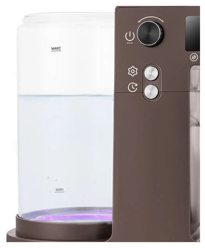 Управление кофеваркой осуществляется с помощью двух кнопок и регулятора. Нажатие на регулятор включает кофеварку. При помощи регулятора настраивают нужное количество чашек кофе, температуру воды, время работы платформы с подогревом и отложенный старт.