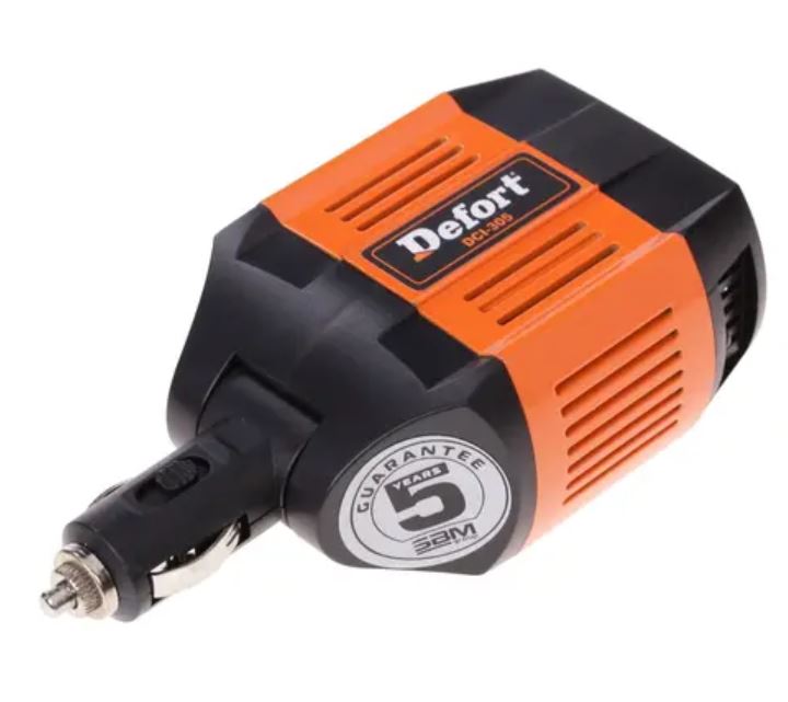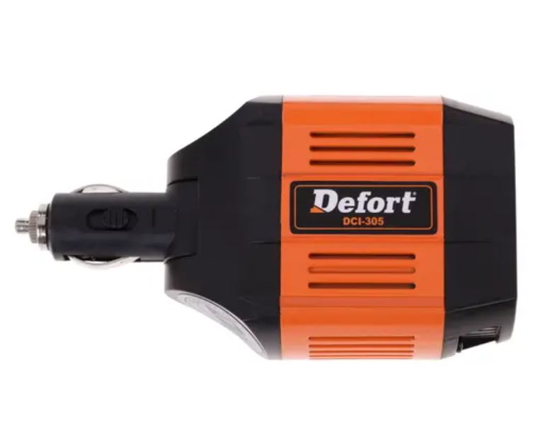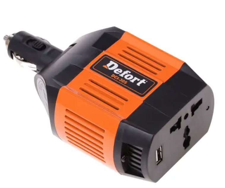 DE FORT DCI-305 преобразовывает напряжение 10.5–16 В, производимое автомобильным аккумулятором, в стандартное переменное напряжение 220–240 В. На корпусе этого инвертора имеется стандартная розетка, в которую включаются такие приборы, как ноутбук, автомобильный телевизор и подобные. Кроме этого, DE FORT DCI-305 оснащен USB-портом, в который можно подключить зарядное устройство для телефона, планшета, навигатора.