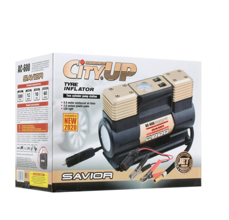 Двухпоршневой компрессор для шин CityUp AC-600 Savior приводится в действие мощным, 300-ваттным электромотором. Модель обладает высоким уровнем производительности. Компрессор способен обеспечить скорость накачивания до 60 л/мин. Даже колеса больших размеров можно будет накачать очень быстро.