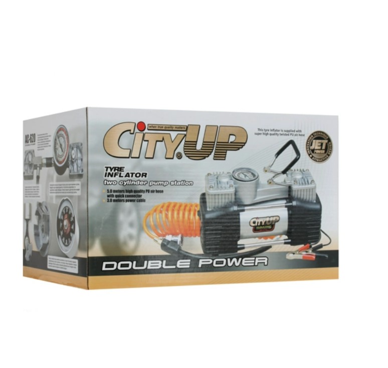 Двухцилиндровый компрессор для шин CityUp AC-620 Double Power отличается повышенным уровнем производительности. Устройство приводится в действие 300-ваттным электромотором, получающим питание непосредственно от аккумулятора. Батарея должна быть 12-вольтовой.