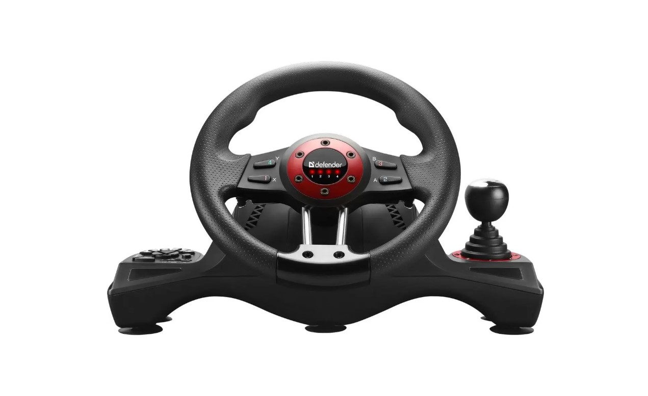 Роскошный игровой руль с креплениями к столу и широким рядом поддерживаемых устройств. Эффект вибрации делает аварии и столкновения более реалистичными (игра должна поддерживать функцию вибрации игрового контроллера). Крепление к столу при помощи присосок и струбцин. Два подрулевых переключателя. Блок педалей — газ и тормоз.