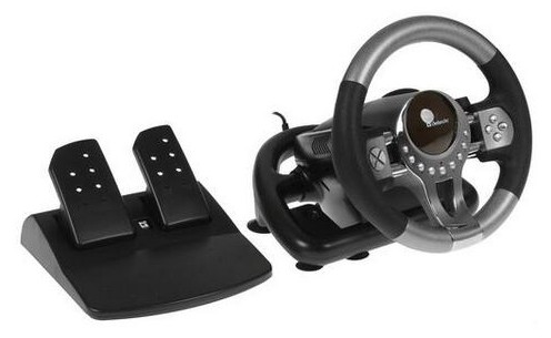 Руль Defender Forsage GTR имеет соединения проводного типа. Он покрыт резиновой оплеткой, которая защищает каркас от повреждений, и приятен для рук. Устройство может поворачиваться на 180°, что в самый раз для гоночных игр. Специальная система D-pad позволит контролировать каждое движение в игре, а педали тормоза и газа выглядят максимально реалистично. Прибор оборудован 12 кнопками и подрулевыми переключателями. Вес устройства – 3.1 кг. Крепление на присосках удерживает руль, он не скользит.