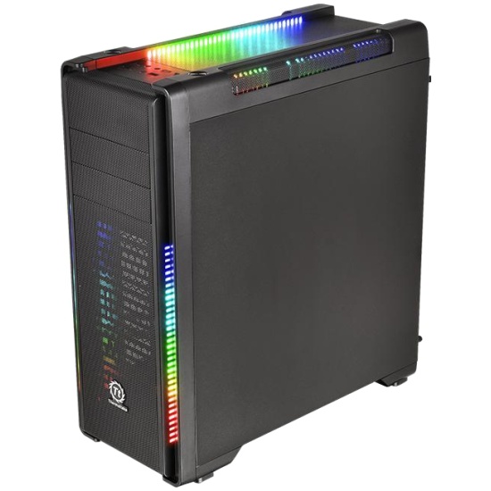 Корпус Thermaltake Versa C21 черный создан в типоразмере Midi-Tower и готов к размещению материнских плат форм-факторов Standard-ATX, Mini-ITX или Micro-ATX со всеми комплектующими. Такой корпус среднего размера привлекает внимание благодаря оригинальным дизайнерским решениям, повлиявшим на его облик. Среди них стоит отметить большое прозрачное окно в его боковой стенке, позволяющее наблюдать за работой оборудования, светодиодную RGB-подсветку передней панели и крышки корпуса.