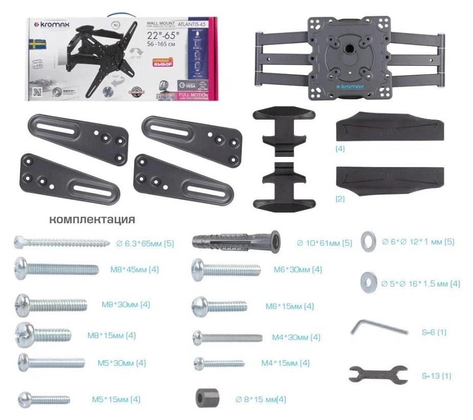 Кронштейн для телевизора KROMAX ATLANTIS-45 обеспечивает возможность поворота приемника в любую сторону до 160 градусов. Предусмотрена коррекция угла наклона от -15 до +5 градусов, что позволяет выбрать наиболее комфортное для просмотра положение. Для монтажа используются крепления VESA в формате от 75х75 до 400х400. Конструкция выполнена в темно-сером цветовом решении, не вносящем дисгармонии в привычный интерьер. Изготовлен кронштейн из качественной стали, является прочным, долговечным и надежным изделием. Предназначен для настенного монтажа устройств диагональю от 22 до 65 дюймов с весом не более 45 кг.