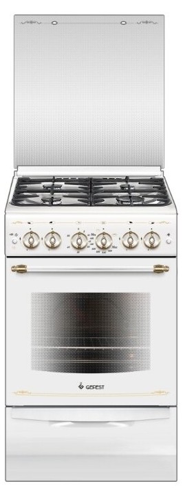 Плита газовая GEFEST 3200-06 не только позволяет быстро приготовить любое блюдо, но и помогает хранить посуду в одном месте, поскольку в самом низу модели установлен вместительный ящик. Рабочая поверхность состоит из 4 газовых горелок, которые приводятся в действие при помощи поворотных механизмов и механической кнопки, подающей искру сразу на все конфорки. Таким же образом разжигается духовой шкаф, объем которого составляет 44 литра. Сама рабочая поверхность, а также внутренние стенки духовки покрыты эмалью, которую легко очищать от пятен.