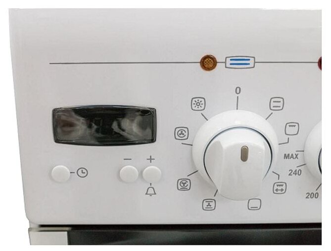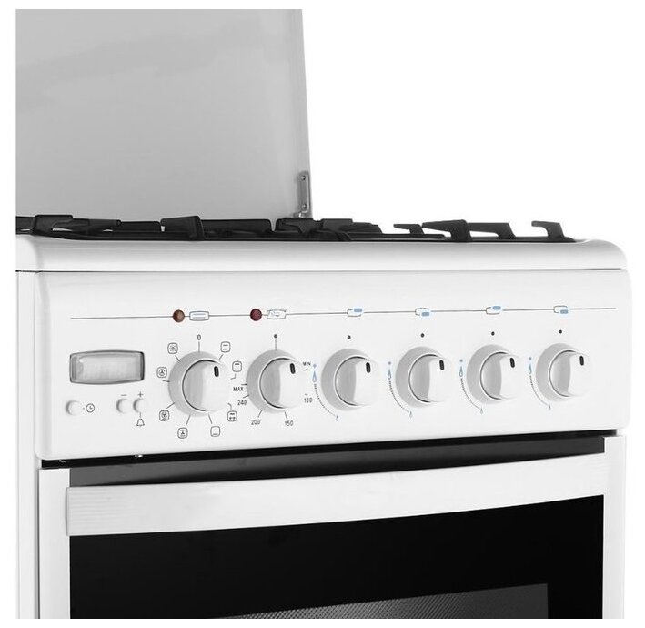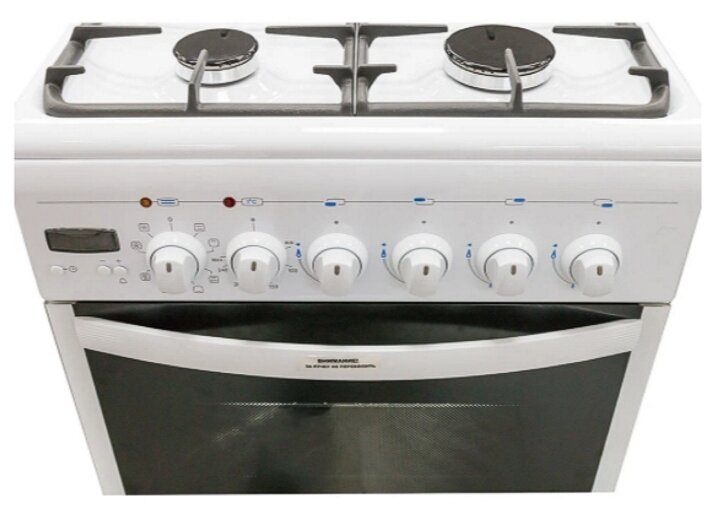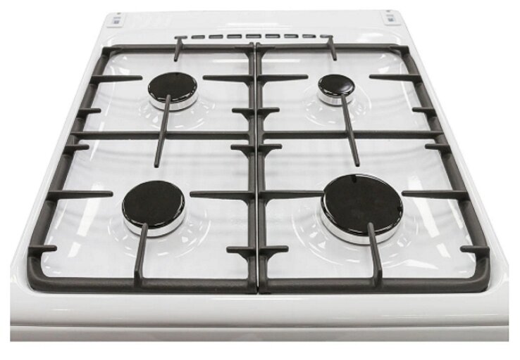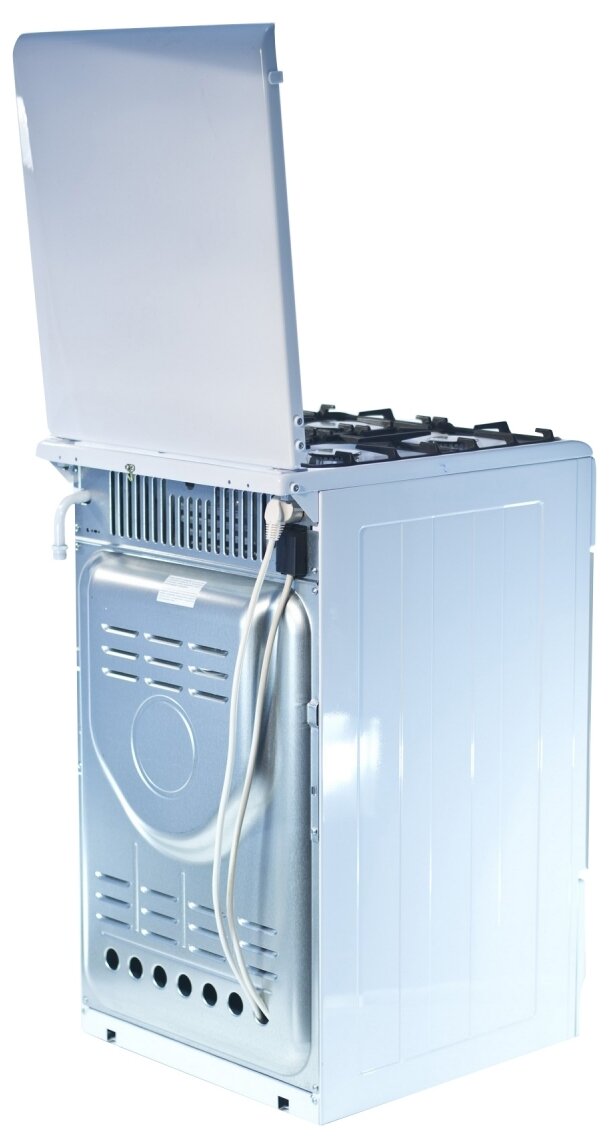 Представленная модель обладает газовой варочной поверхностью и электрической духовкой. Варочная поверхность изготовлена из эмалированной стали и оснащена чугунной решеткой для установки посуды. Все 4 конфорки включаются посредством использования электроподжига. Электроподжиг встроен в поворотную ручку каждого выключателя. Все конфорки дополнены опцией газ-контроля для дополнительной безопасности.При этом представленная духовка дополнена грилем, вертелом и термостатом. Шашлычница.