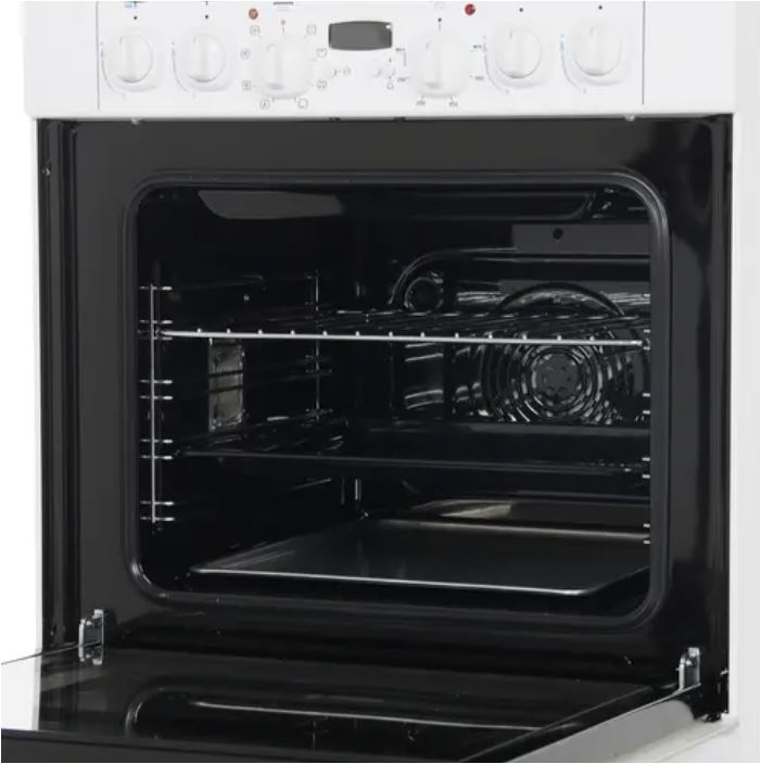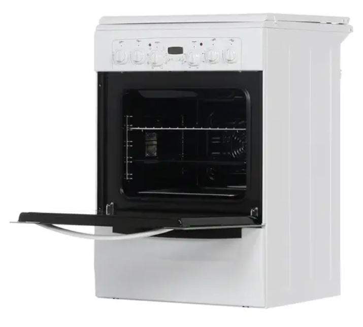Плита имеет механическое управление: для розжига конфорок и переключения опций предназначены шесть регуляторов. Доступны такие функции, как верхнее и нижнее нагревание, турбогриль. Одним из преимуществ модели является таймер со звуковым сигналом и дисплеем, который служит и как обычные часы. В духовом шкафу предусмотрена подсветка, что позволяет следить за процессом приготовления блюд.