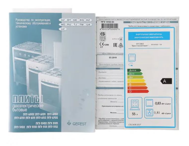 Gefest 6102-03 безопасна в эксплуатации: конфорки оснащены системой защиты для контроля подачи газа и предотвращения возможной утечки. Комплектация плиты дополнена глубоким и плоским противнями, а также решеткой.