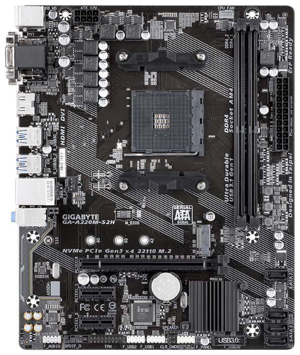 Материнская плата GIGABYTE GA-A320M-S2H – популярная модель от широко известного производителя. Плата будет полезна любителям процессоров AMD, желающим создать надежный компьютер, предназначенный для универсального применения. Соответствие модели форм-фактору Micro-ATX дает возможность использования компактного корпуса. Плата поддерживает до 32 ГБ памяти DDR4. Для установки видеоадаптера используется слот PCI-E x16. 2 слота PCI-E x1 можно будет использовать для монтажа плат расширения разного назначения.