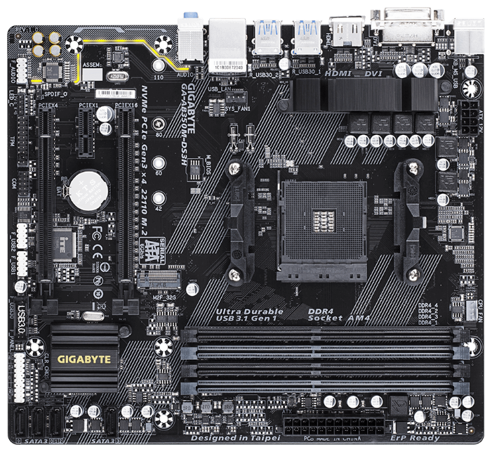 Являясь основой для сборки производительного системного блока, материнская плата GIGABYTE GA-AB350M-DS3H V2 предлагает целый ряд интерфейсов, используемых для присоединения периферийных устройств/компонентов системы. Среди ее разъемов представлены PCI-E x16, 4x SATA 6Gb/s, 4x USB 2.0 и 4x USB 3.0, а также интерфейсы-видеовыходы HDMI, DVI. Плата получила также гигабитный сетевой и звуковой адаптеры.
