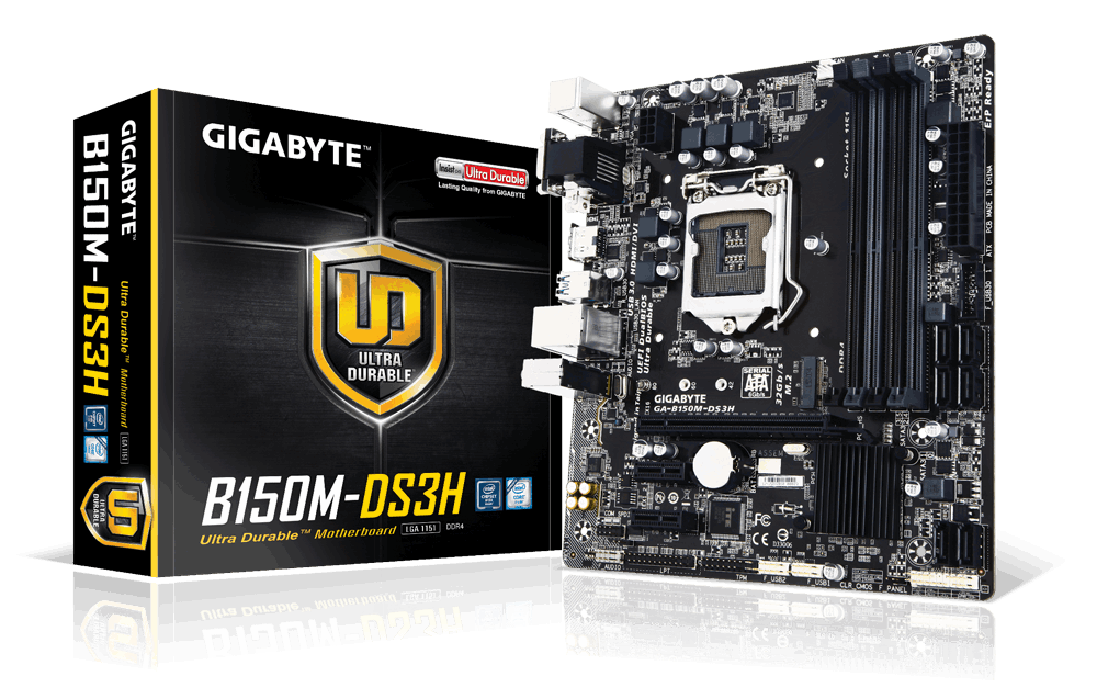 Материнская плата LGA 1151 GIGABYTE GA-B150M-DS3H B150/4xDDR4/1xPCI-e16/2xPCI-e1/6xSATA3/1xM.2/4xUSB3.1/4xUSB2.0/2xPS/2/1xDVI-D/1xVGA/1xHDMI/1
