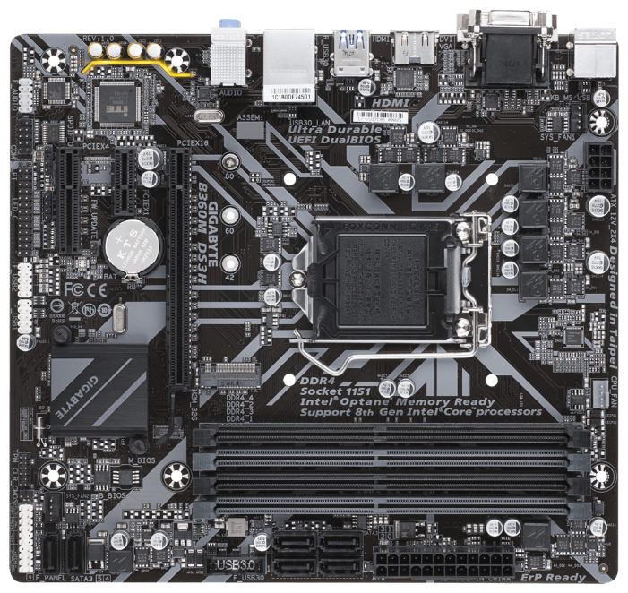 Материнская плата GIGABYTE B360M DS3H обладает совместимостью с широчайшим образом распространенными процессорами Intel LGA 1151-v2. Модель базируется на чипсете Intel B360. Плата, соответствующая форм-фактору Micro-ATX, рассчитана на сборку универсального компьютера, который может быть полезен как в офисе, так и дома. Плата имеет один слот PCI-E x16 и один слот PCI-E x1. Максимально допустимый объем памяти составляет 64 ГБ. Поддержка NVMe дает возможность использования высокоскоростных твердотельных накопителей.