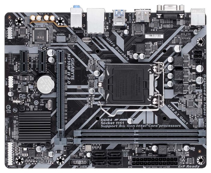 Материнская плата GIGABYTE H310M H 2.0 имеет прямоугольную форму: ее габаритные размеры составляют 226x174 мм. Плата подойдет для сборки офисной или домашней системы, которая преимущественно используется для работы с офисными программами и интернет-браузерами. Для установки видеокарты можно использовать слот PCI-E x16. Достоинством компактной платы является наличие 2 слотов PCI-E x1.