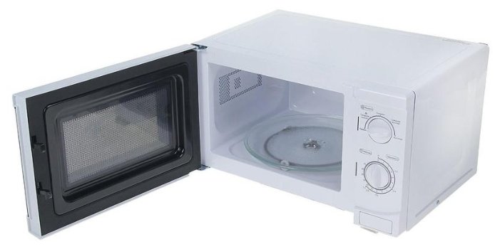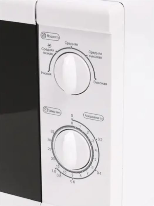 Удобное управление изделием осуществляется при помощи 2 поворотных переключателей. У этой модели микроволновки доступен выбор 5 уровней мощности для разогревания разных блюд.