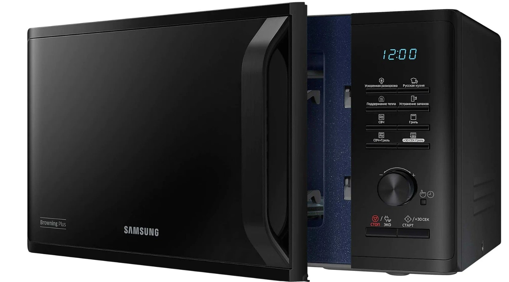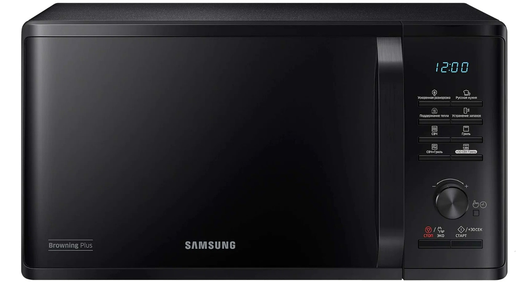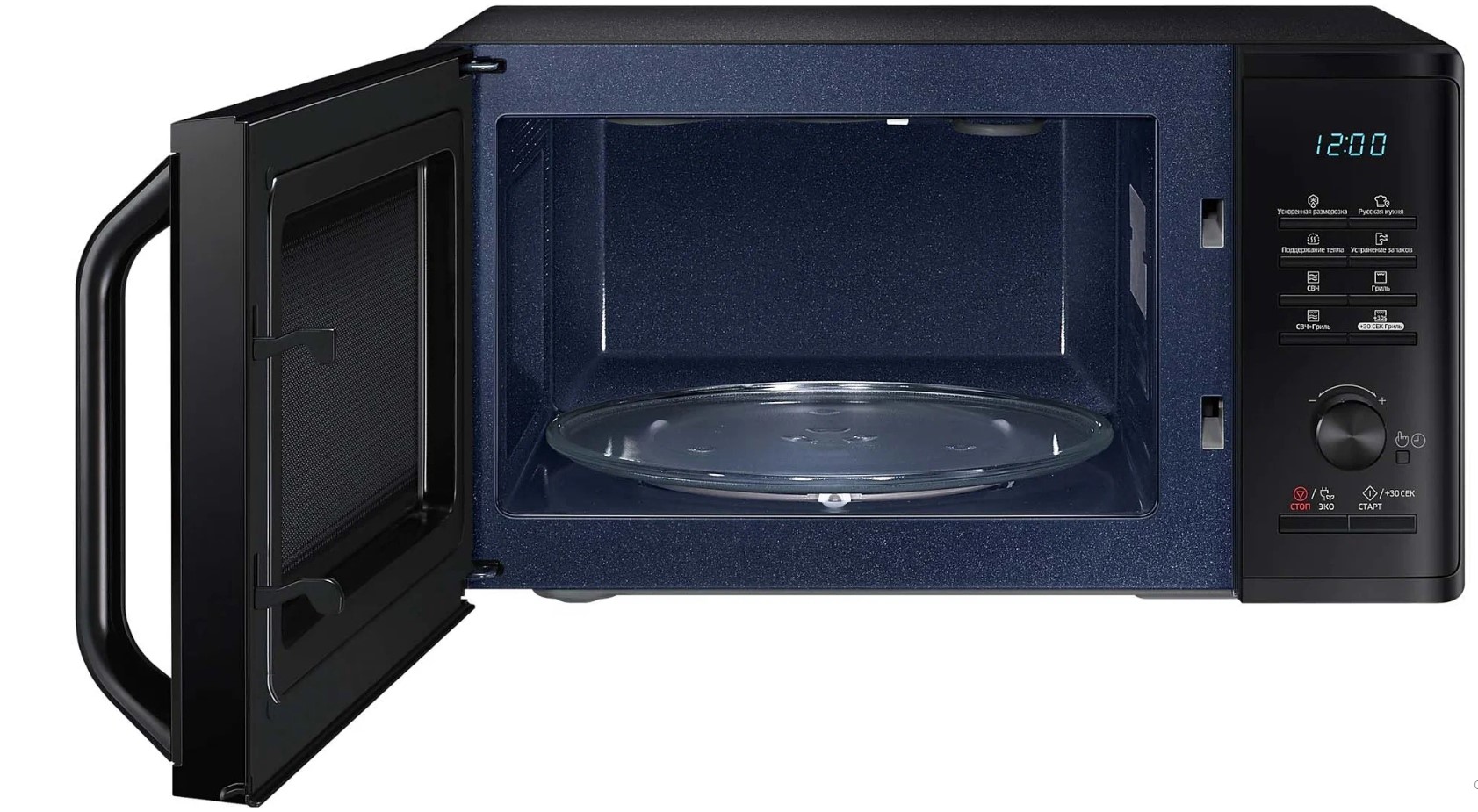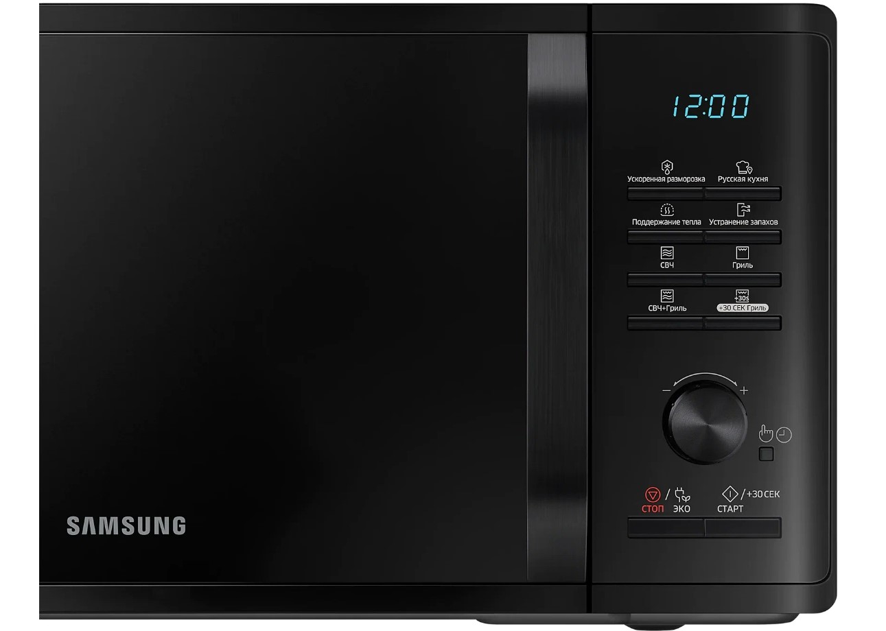Внутренним покрытием камеры микроволновой печи Samsung MG23K3515AK стала биокерамическая эмаль, которая проста в уходе, легко очищается и выглядит эстетично в течение длительного времени. Приверженцев здорового питания порадует наличие функции гриля – мясо, овощи, рыба – все это будет равномерно запечено без риска пересушить, все благодаря режиму «микроволны+гриль» и системе равномерного распределения микроволн T.D.S. Внутренний объем камеры – 23 л. Имеются 20 программ готовки, кроме того, вы сможете не только подогреть блюда, но и оперативно разморозить продукты. Samsung MG23K3515AK отличается наличием режима удаления запахов, а также таймером на 1 ч 39 мин. – в ней есть все, чтобы вы пользовались этим прибором с удовольствием.