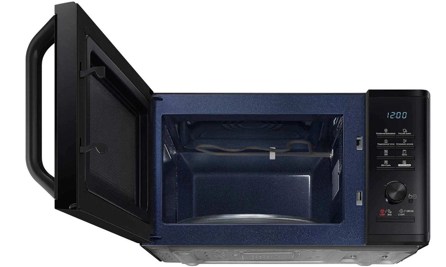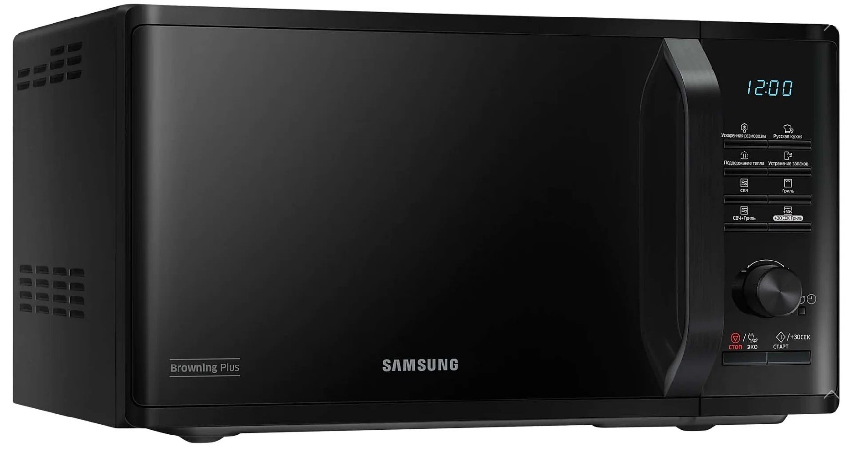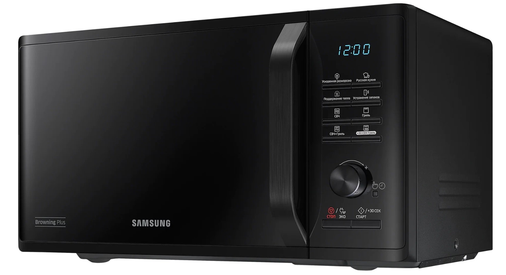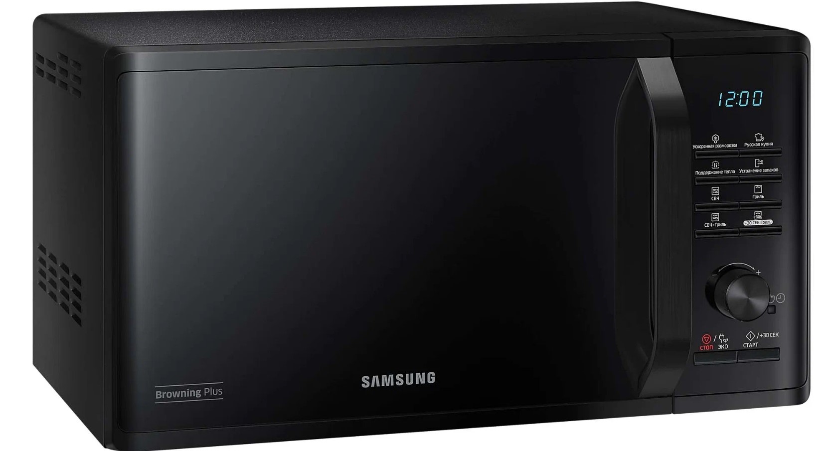 Внутренним покрытием камеры микроволновой печи Samsung MG23K3515AK стала биокерамическая эмаль, которая проста в уходе, легко очищается и выглядит эстетично в течение длительного времени. Приверженцев здорового питания порадует наличие функции гриля – мясо, овощи, рыба – все это будет равномерно запечено без риска пересушить, все благодаря режиму «микроволны+гриль» и системе равномерного распределения микроволн T.D.S. Внутренний объем камеры – 23 л. Имеются 20 программ готовки, кроме того, вы сможете не только подогреть блюда, но и оперативно разморозить продукты. Samsung MG23K3515AK отличается наличием режима удаления запахов, а также таймером на 1 ч 39 мин. – в ней есть все, чтобы вы пользовались этим прибором с удовольствием.