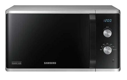 Микроволновая печь Samsung MS23K3614AS имеет увеличенный объем, в камеру можно поставить блюдо большого размера и готовить для всей семьи. На дверце массивная ручка для открывания, это дополнительный элемент дизайна. В дополнение к обычным функциям разогрева и разморозки есть режим ускоренной разморозки, небольшие порции продуктов можно разморозить всего за несколько минут и сэкономить время. Если вы не открыли дверцу сразу после окончания работы, через минуту звуковой сигнал снова вам об этом напомнит. Внутри камера покрыта слоем биокерамики, которая устраняет неприятные запахи. Можно выбрать один из шести уровней мощности. Есть режим “Русская кухня”, на табличке внутри камеры есть для этого все подсказки.