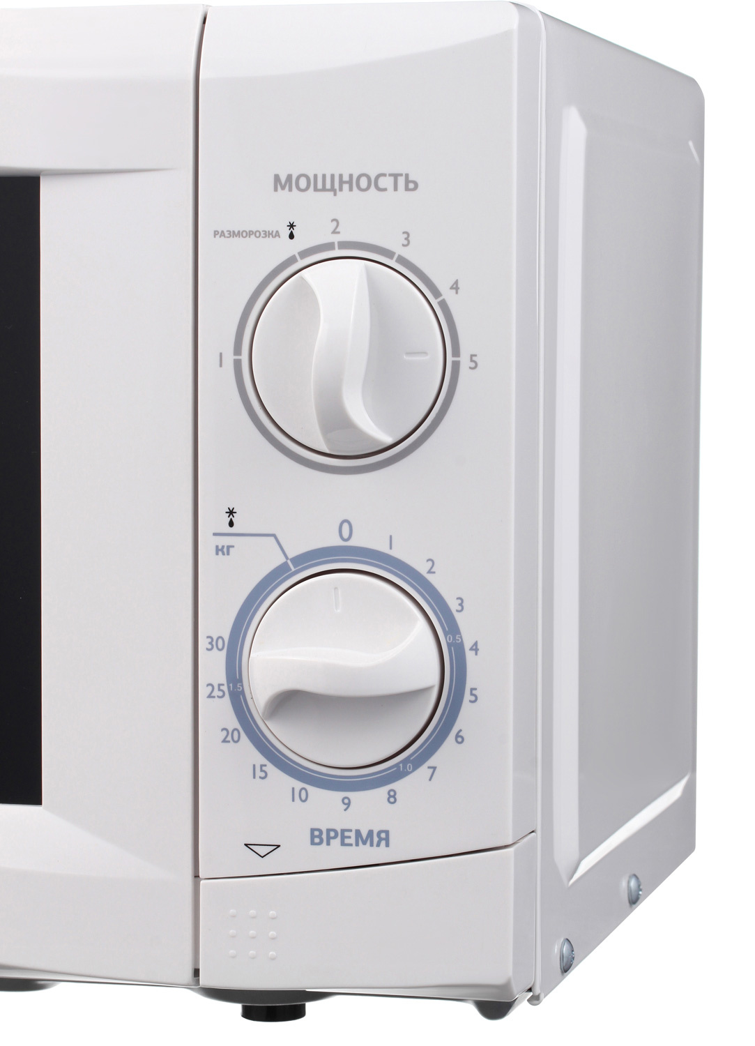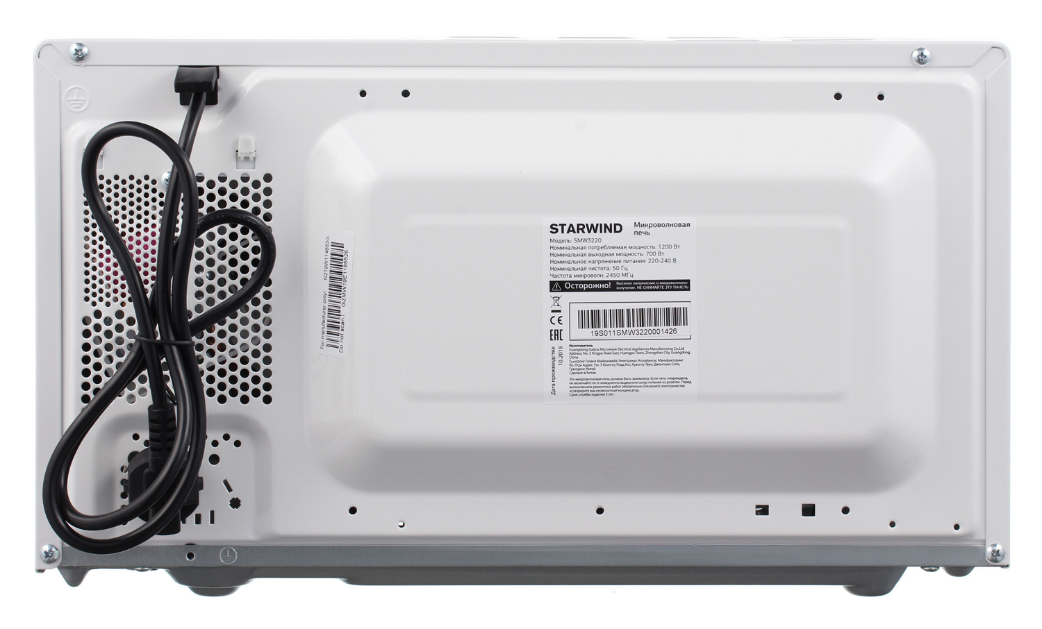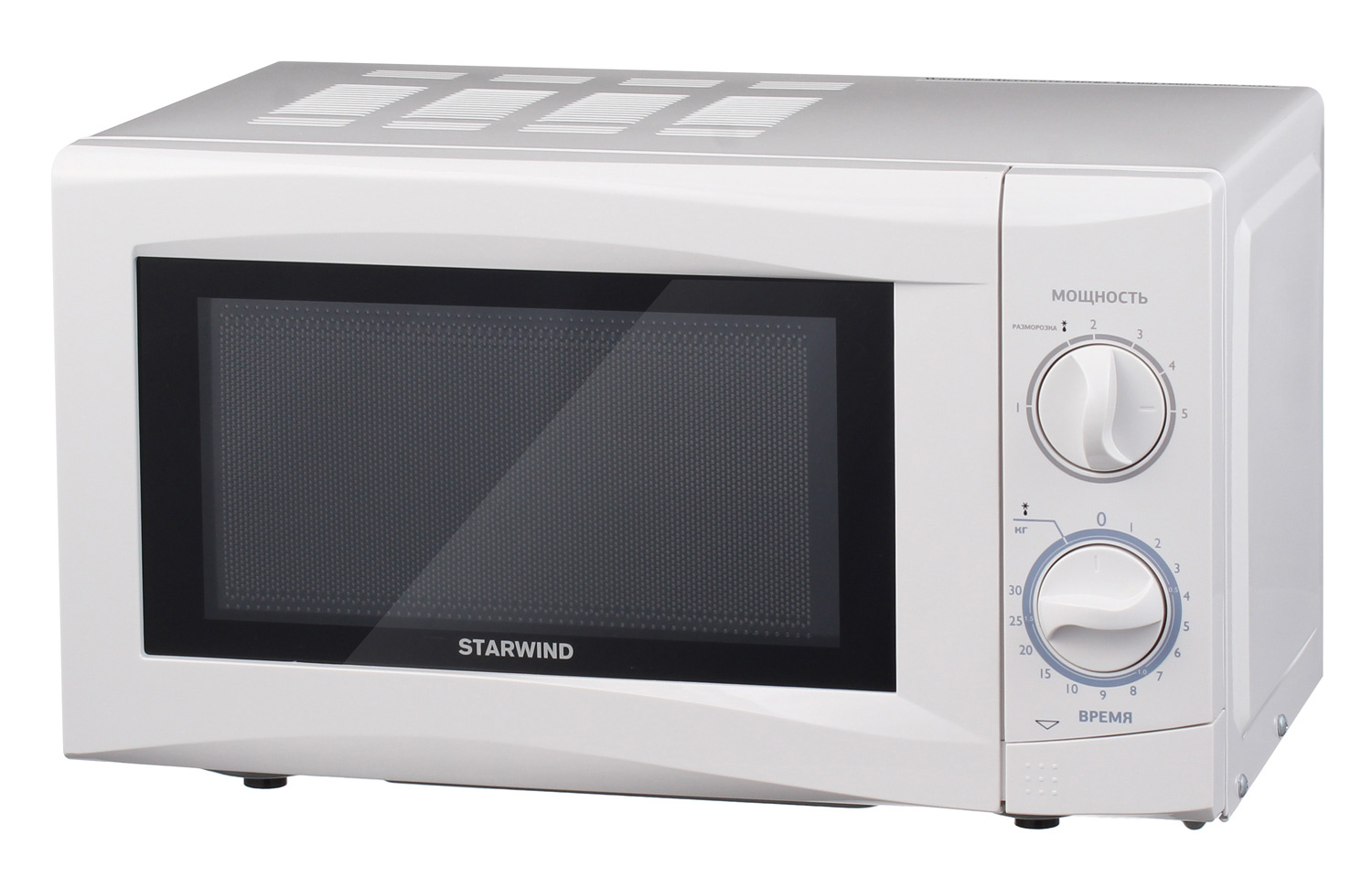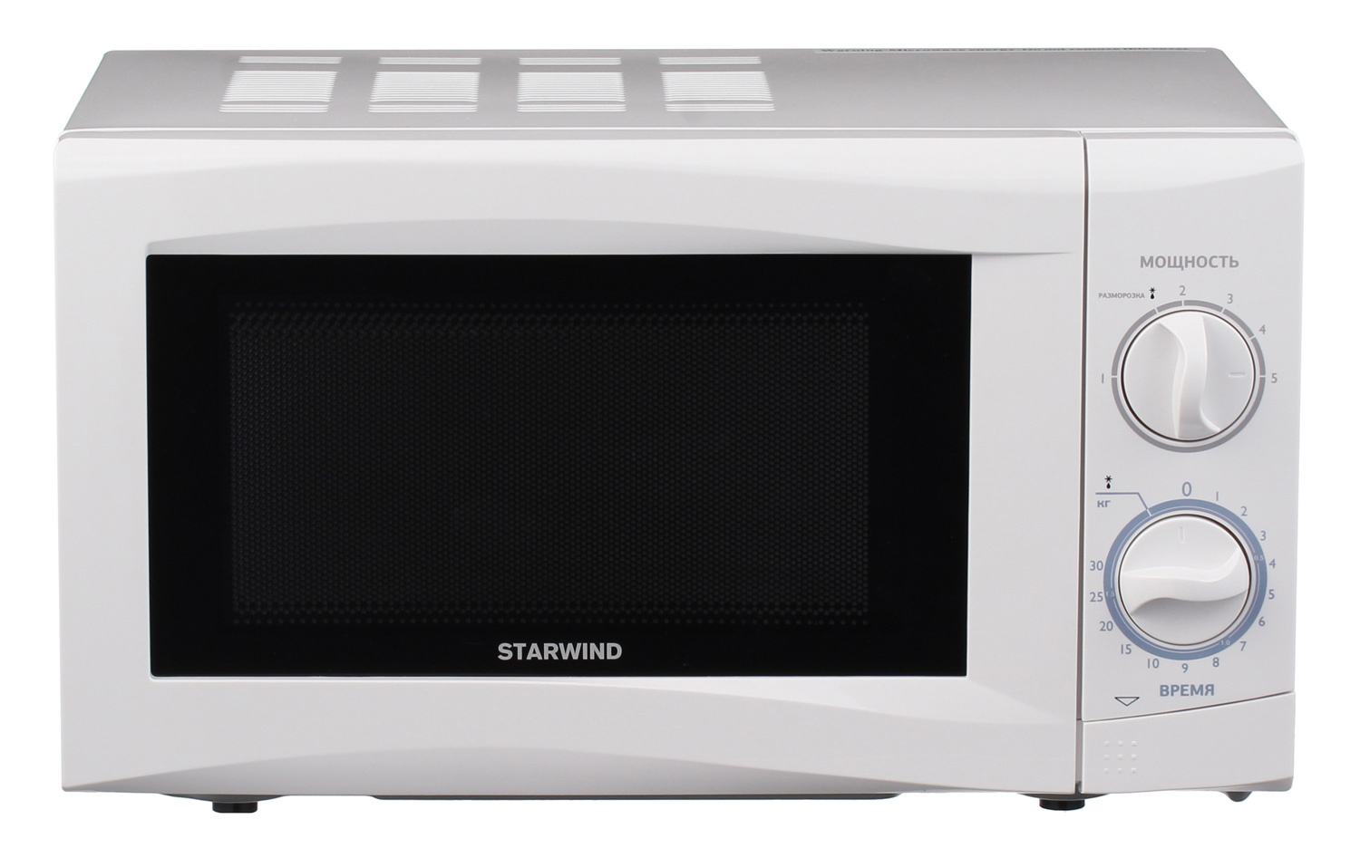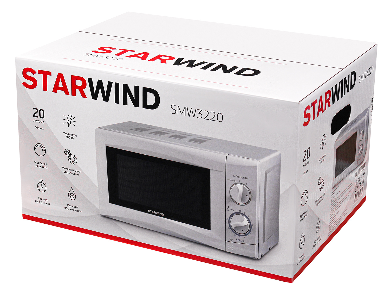 Микроволновая печь STARWIND SMW3220 выполнена в классическом дизайне. Объем внутренней камеры в данной модели составляет 20 литров, а диаметр поворотного стола – 245 мм. Максимальная мощность, на которой работает прибор – 700 Вт, но с помощью ручки можно отрегулировать на меньшую скорость, а также, выбрать режим разморозки. Для приготовления или разогрева продуктов пользователю предоставляется возможность выбора времени до 30 минут, по 1 минуте до отметки «10» и далее с интервалом по 5 минут до «30». Внутренняя площадь полностью покрыта эмалью, что упрощает уход за изделием и продлевает срок службы. Питание осуществляется от сети 220 В с помощью съемного кабеля, достаточной длины для домашнего использования.