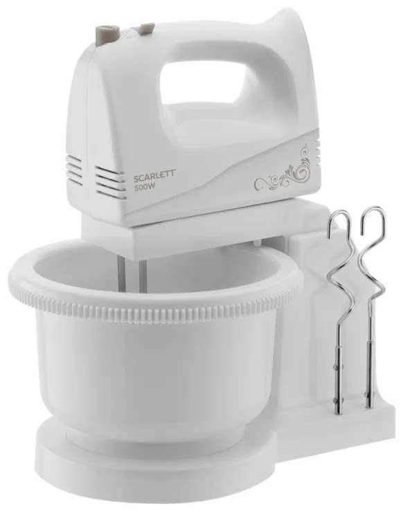 Миксер с чашей Scarlett SC-HM40B03 мощностью 500 Вт работает в 5 скоростях. Прибор позволяет взбивать коктейли и муссы, качественно замешивать тесто. С его помощью можно за пару минут приготовить нежное суфле, взбить яичные белки или молочные сливки до густой, нежной пены. Миксер крепится на подставку, избавляя Вас от необходимости держать работающий прибор на весу. Вращающаяся чаша миксера ускоряет процесс взбивания. В основании подставки миксера есть удобные отверстия для хранения крюков.