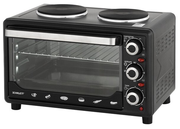Электрическая печь SC-EO96O99 - прибор 4-в-1 электрическая и кухонная плита с 2 конфорками одновременно! SC-EO96O99 оснащена конвекцией, для равномерного распределения температуры, световым индикатором, таймером на 60 минут со звуковым сигналом. Прибор позволяет экономить место на кухне за счет расширенного функционала и наличия дополнительных конфорок. В комплект входят съемная решетка и поддон с покрытием из жаропрочной эмали.