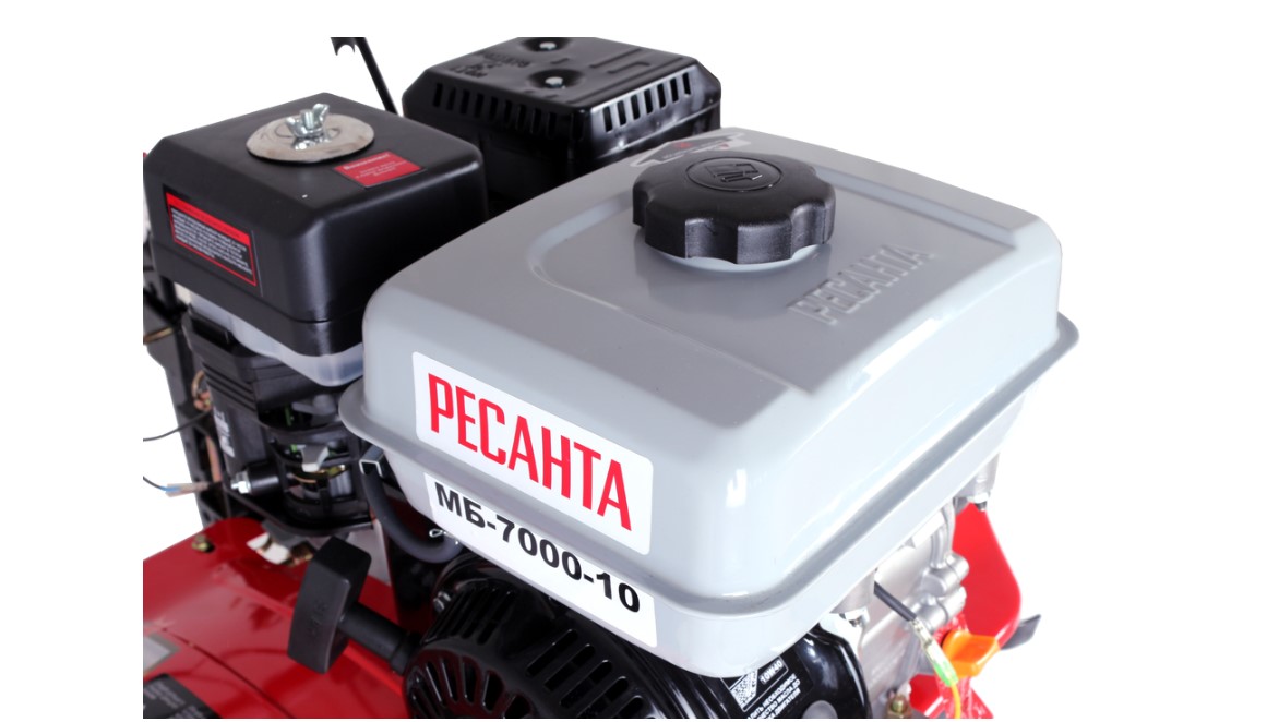 МБ-7000 P-10 Ресанта имеет две передачи вперёд и одну назад, которые делают эту сельскохозяйственную машину более маневренной. Модель отличается хорошей проходимостью, так как машина получила большие колёса – 4х10 с глубоким протектором. Специальные щитки защитят оператора от комьев земли и пыли. Управление вынесено на рукояти, ручки прорезиненные с рельефным покрытием.