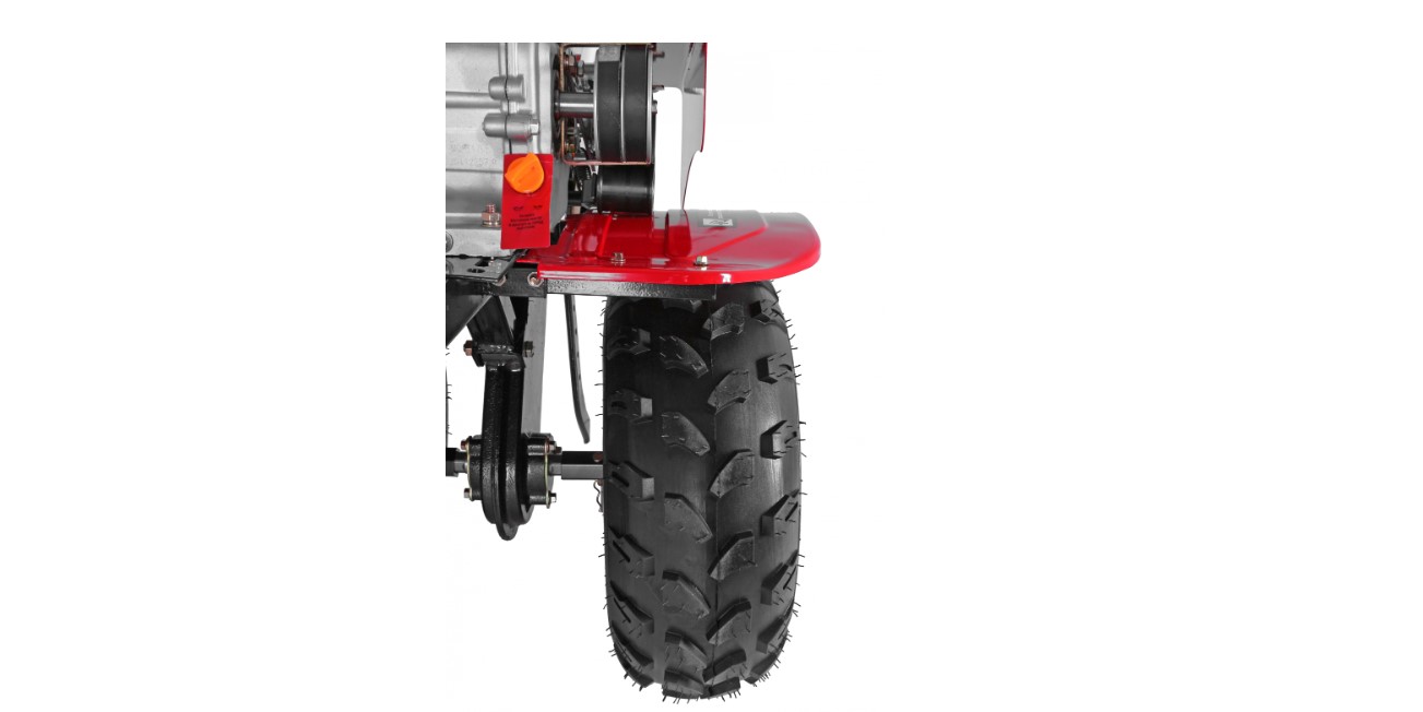 Машина имеет шестеренчато-цепной редуктор в чугунном корпусе. Активная навеска подключается через ременной привод. Мотоблок имеет 3 передачи: 2 впереди /1 назад