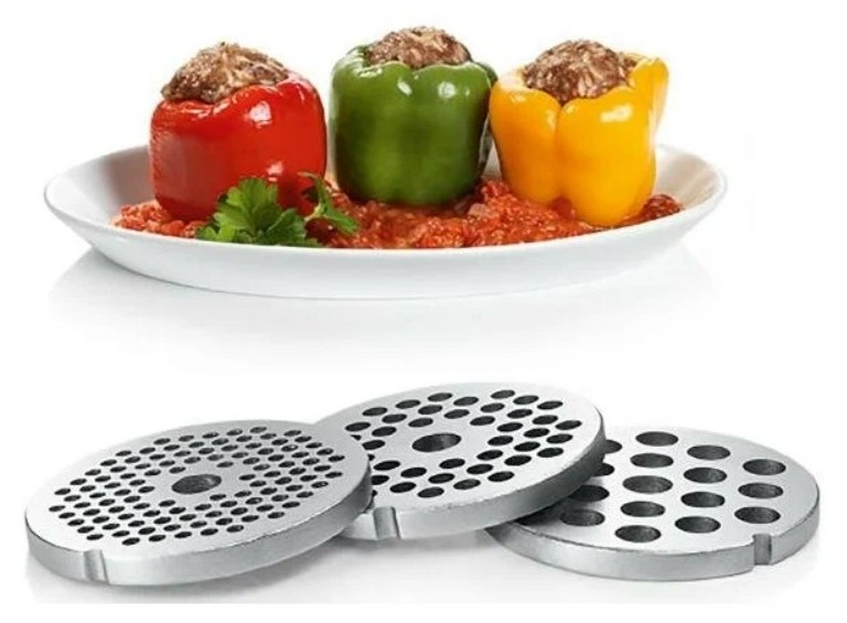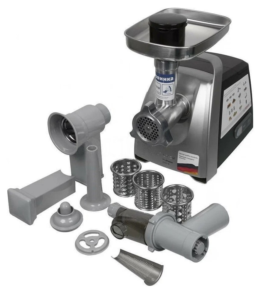 Максимальное время непрерывной работы составляет 15 минут. Далее агрегату необходимо дать отдохнуть. В противном случае сработает автоматическая защита от перегрева, которая предохранит двигатель от перегрузки. В комплектацию бытового прибора входит большое количество насадок, которые позволяют готовить не только фарш, но и шинковать овощи, а также делать свежевыжатые соки.