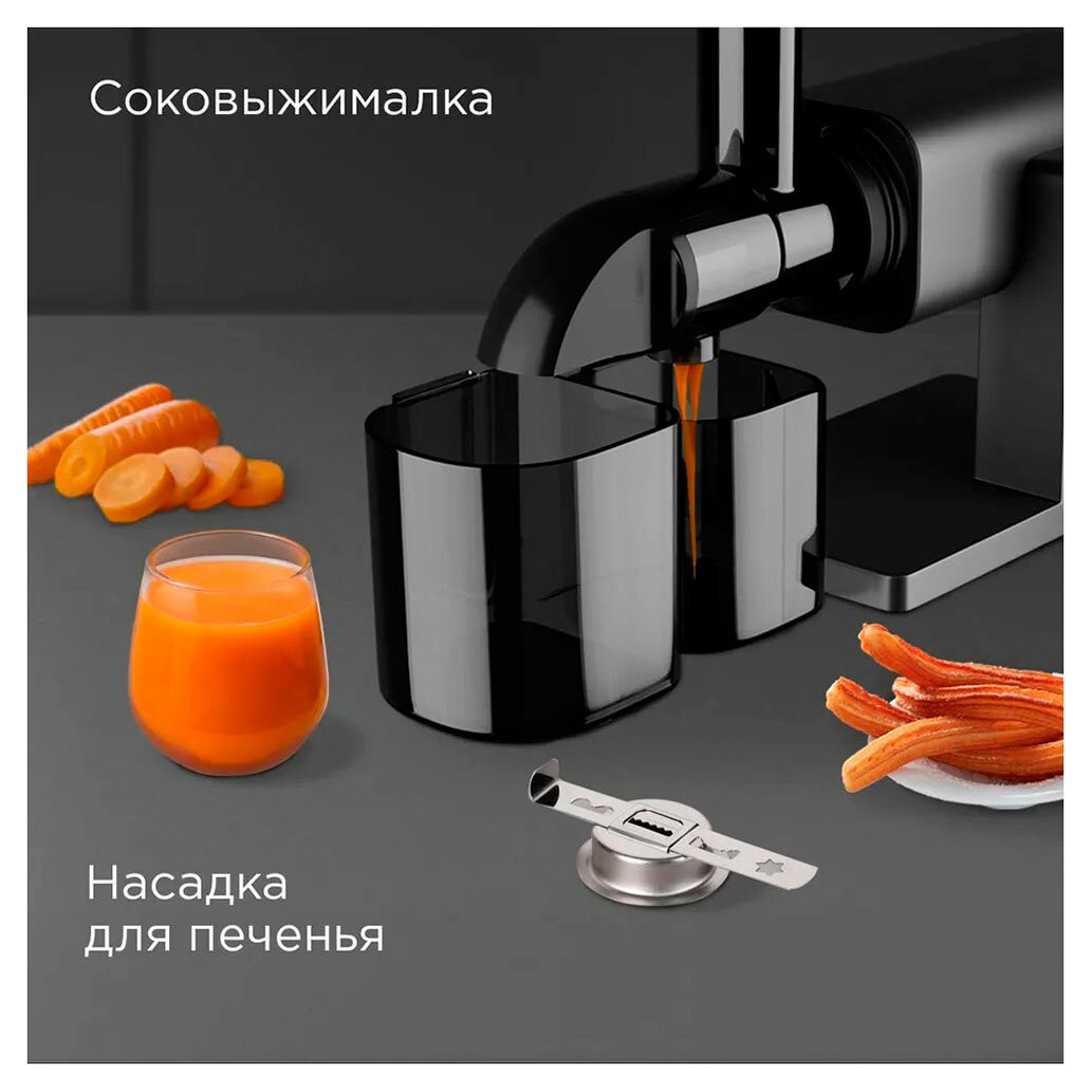 МG500 — мясорубка, которая справится с 10 различными задачами. Комплект насадок дает возможность готовить фарш, колбаски и кеббе, фруктовое пюре и салаты, а также делать сок и печенье. Мясорубка сэкономит деньги и место на кухне: не придется покупать 10 отдельных устройств.
