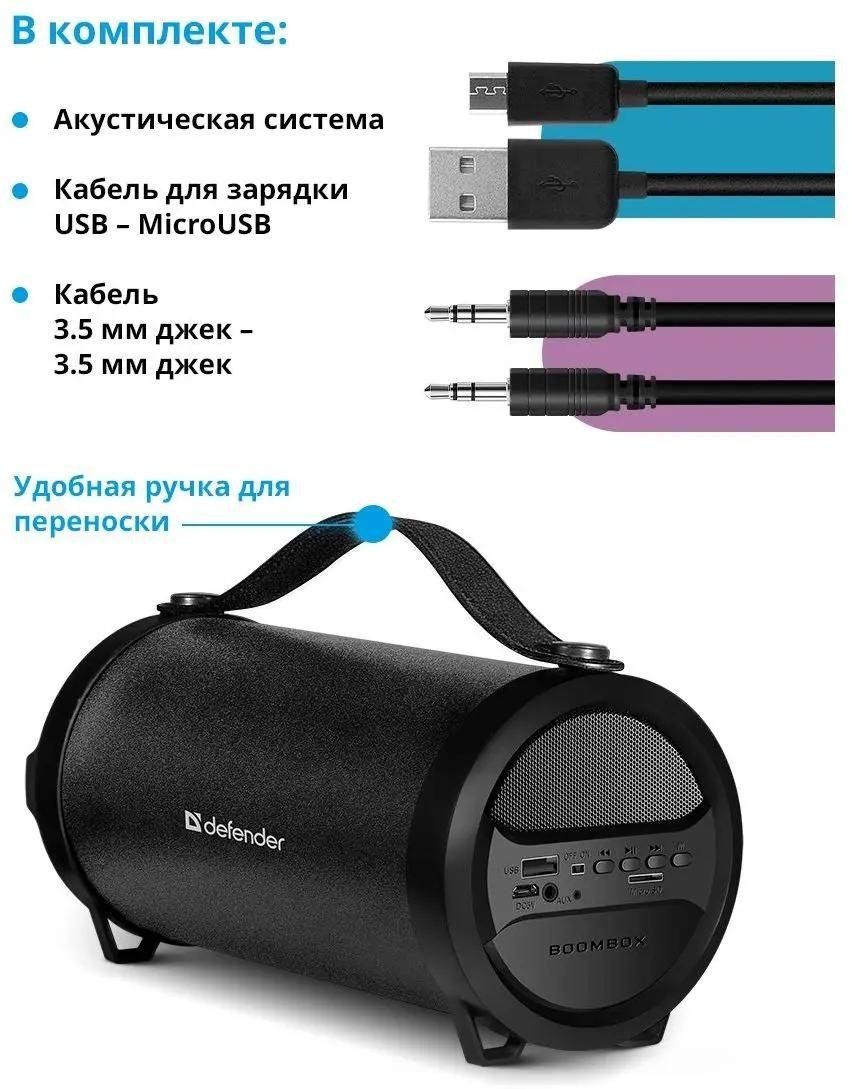 Встроенный FM-приемник - встроенный тюнер превращает колонку в полноценный радиоприемник. Вы всегда сможете послушать ваши любимые радиопередачи или музыку. Поддержка USB-накопителей и MicroSD-карт - наличие слота для карт памяти стандарта Micro-SD или USB дает возможность воспроизведения музыкальных файлов без использования компьютера. Достаточно вставить в слот карту с записанными на ней WAV- или MP3-файлами - и можно наслаждаться музыкой. Дополнительный AUX-аудиовход - с помощью AUX-входа и кабеля 3,5-мм джек - 3,5-мм джек. Колонки можно подключить к компьютеру (плееру, мобильному телефону) и использовать как мощный динамик. Увеличенное время работы от аккумулятора. Удобная ручка для переноски.