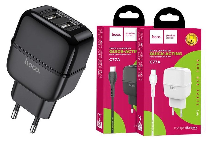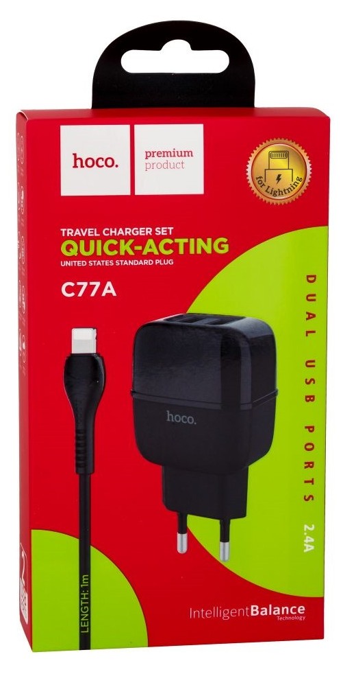 Компактное сетевое зарядное устройство HOCO C77A Highway имеет 2USB выхода, благодаря этому вы можете заряжать два гаджета одновременно. Выходной силы тока 2.4А достаточно, чтобы заряжать не только телефон, но и планшет. Если задействованы оба разъема, то максимальная сила тока составит 2.4А и будет делиться пропорционально на два порта. Благодаря широкому диапазону входного напряжения от 100 до 240 В сетевой адаптер может использоваться во многих странах мира. Встроенная многоуровневая система защит от скачков напряжения и короткого замыкания делает использование зарядки абсолютно безопасным, а также исключает вероятность перезаряда заряжаемых гаджетов. Аксессуар совместим с большинством существующих мобильных устройств, для подзарядки которых используется USB провод. В комплекте к нему также входит кабель с коннектором USB на 8-pin, lighting длиной 1 метр.