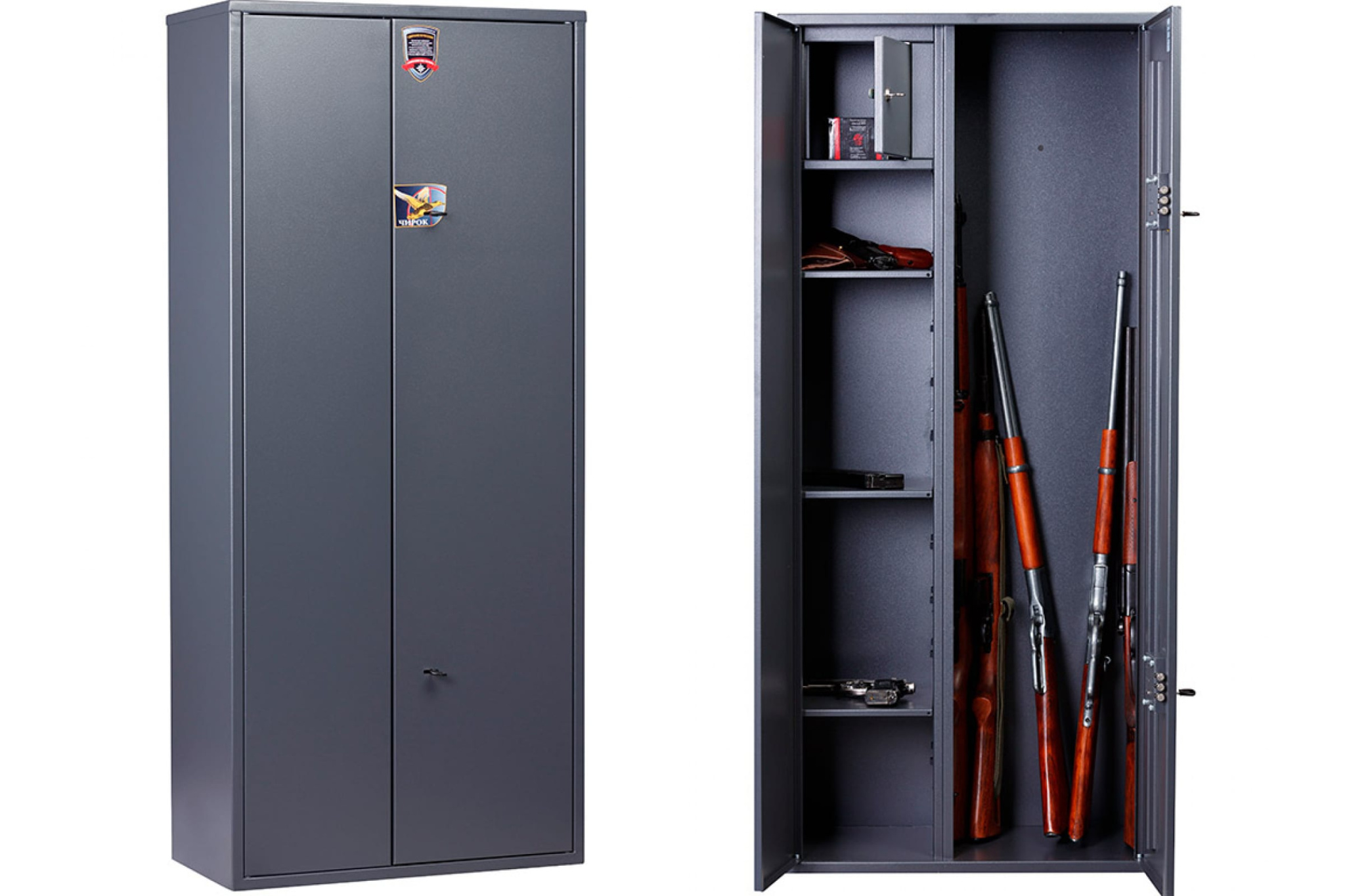 Сейф Чирок AIKO 1462 выполнен из металла толщиной 1,5 мм. Внутри находится три полки. Патронное отделение объемом 13,8 литра размещено в верху сейфа. Оборудование крепится к стене при помощи анкерных болтов в случае необходимости. Защита обеспечивается двумя ключевыми замками.