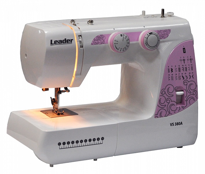 Швейная машина LEADER VS 380A с бело-розовым пластиковым корпусом эстетично выглядит и привлекает хорошей эргономикой, легкостью настройки и обслуживания. Она укомплектована лапками, шпульками, иглами, распарывателем и аксессуарами для ухода за механическими частями - смазочным маслом, отверткой. В процессе работы машина обеспечивает яркую подсветку рабочей зоны.