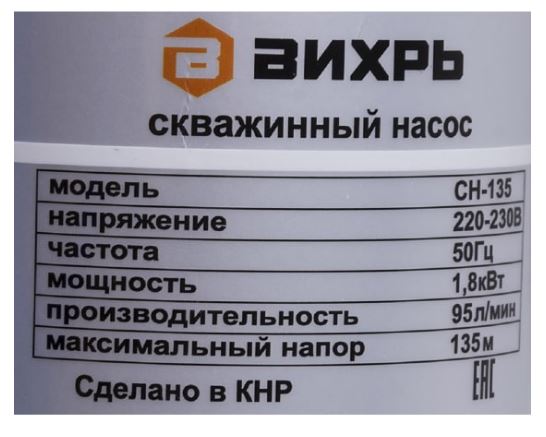 Погружной насос Вихрь СН-135 предназначен для подачи чистой воды в дом, а также для организации поливочной системы сельскохозяйственного участка. Работа устройства основана на центробежном электрическом двигателе с мощностью 1800 Вт, что обеспечивает пропускную способность до 5700 литров жидкости в час с глубины до 60 метров и напором до 135 метров. Благодаря этой особенности насос Вихрь СН-135 способен эффективно откачивать воду из различных резервуаров, открытых водоемов, в также шахтных колодцев и скважин с внутренним диаметром от 102 мм. Максимально допустимая температура забираемой жидкости не должна превышать 35 °C.
