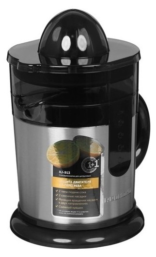 Корпус соковыжималки Redmond RJ-913 выполнен из высококачественной нержавеющей стали, не подверженной механическим повреждениям и образованию коррозии, что обеспечивает устройству длительный срок службы. За счет наличия специальных прорезиненных накладок на ножках модель максимально устойчива даже при нахождении на скользкой поверхности. Длина шнура 0,9 м оптимальна для комфортной эксплуатации. Устройство снабжено двумя сменными конусными насадками разного диаметра, которые позволяют получать фреш как из крупных апельсинов и грейпфрутов, так и из небольших мандаринов, лимонов и лаймов.